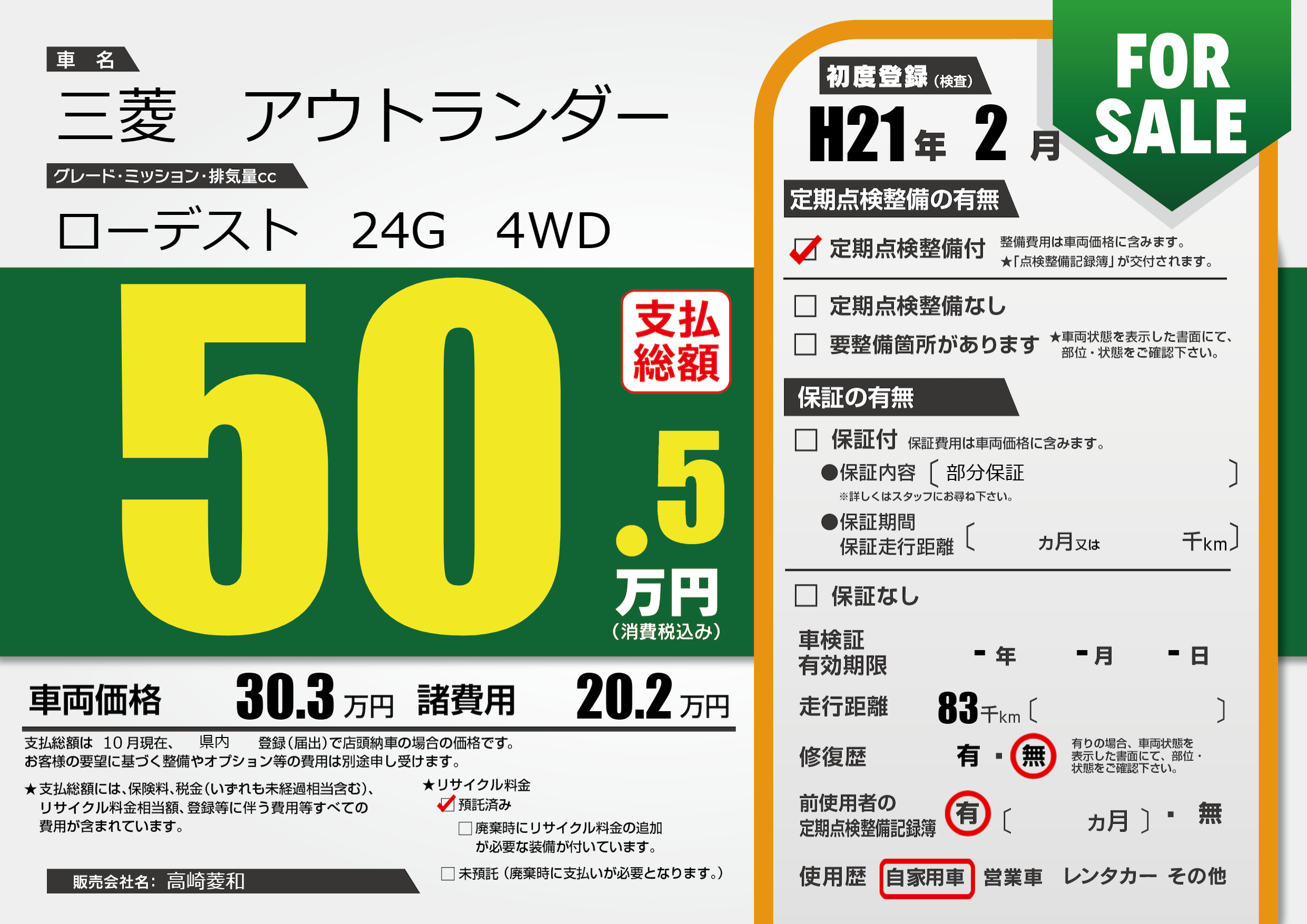 | 走行キロ | 8.3万km | 初年度登録 | H21年2月 |