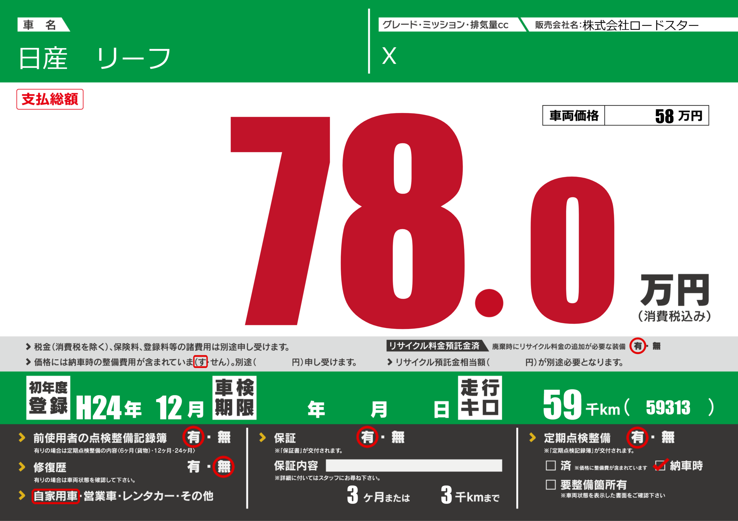 | 車名 | 日産 リーフ | グレード ミッション 排気量 |