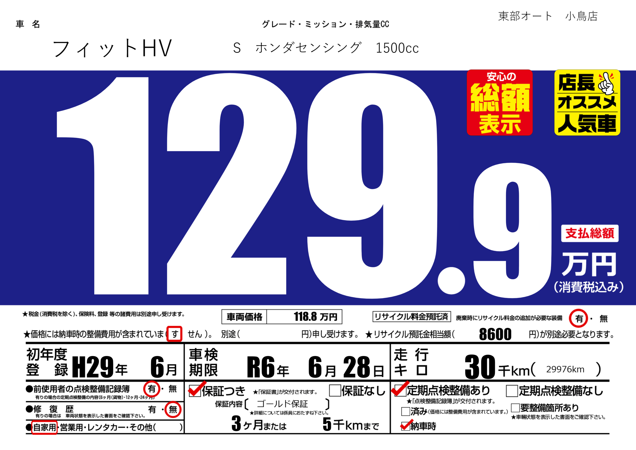 | 車検制限 | R6年 6月 28日 | ||
