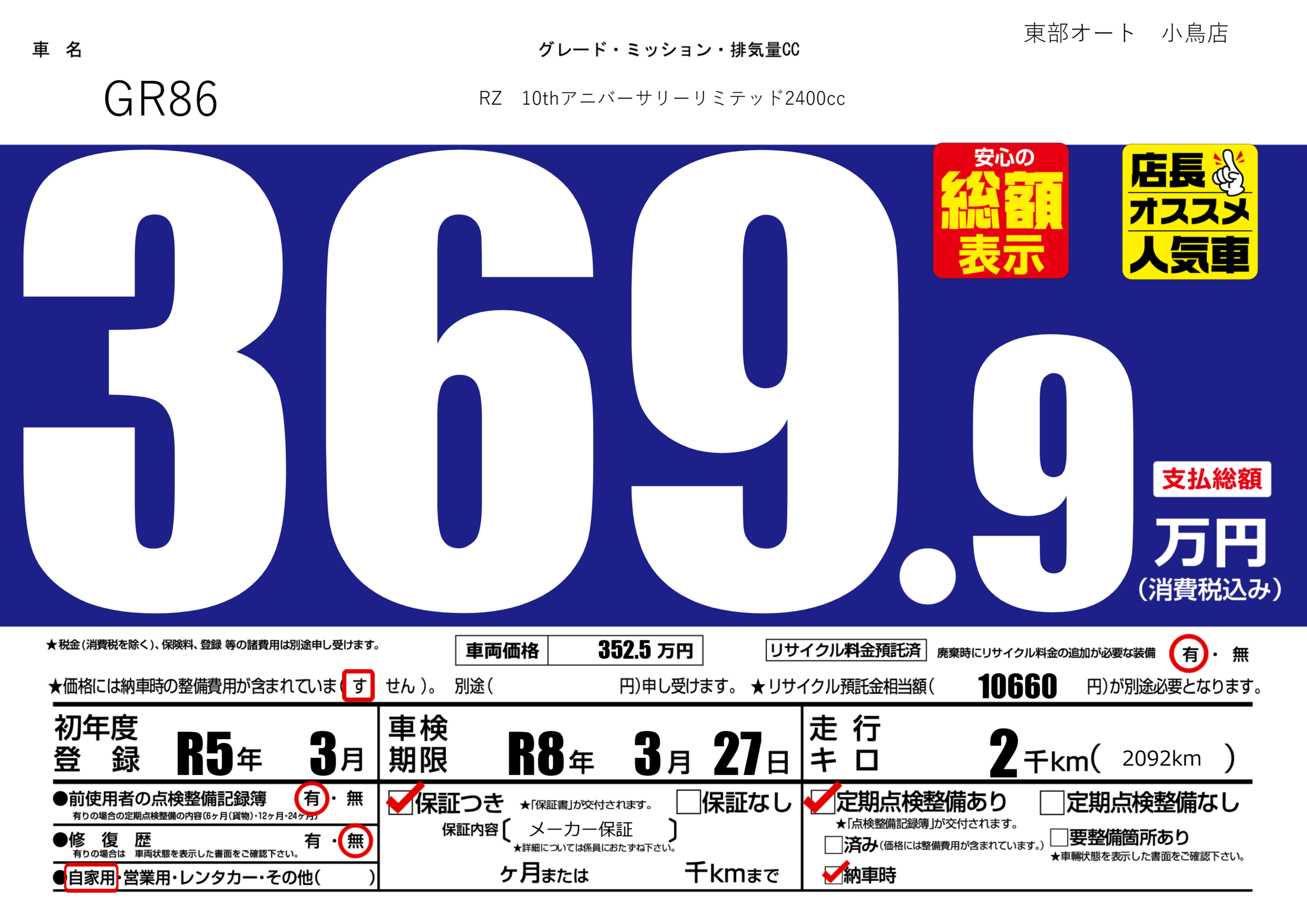 あり | リサイクル預託金相当額 | ( 10660円)が別途必要 |