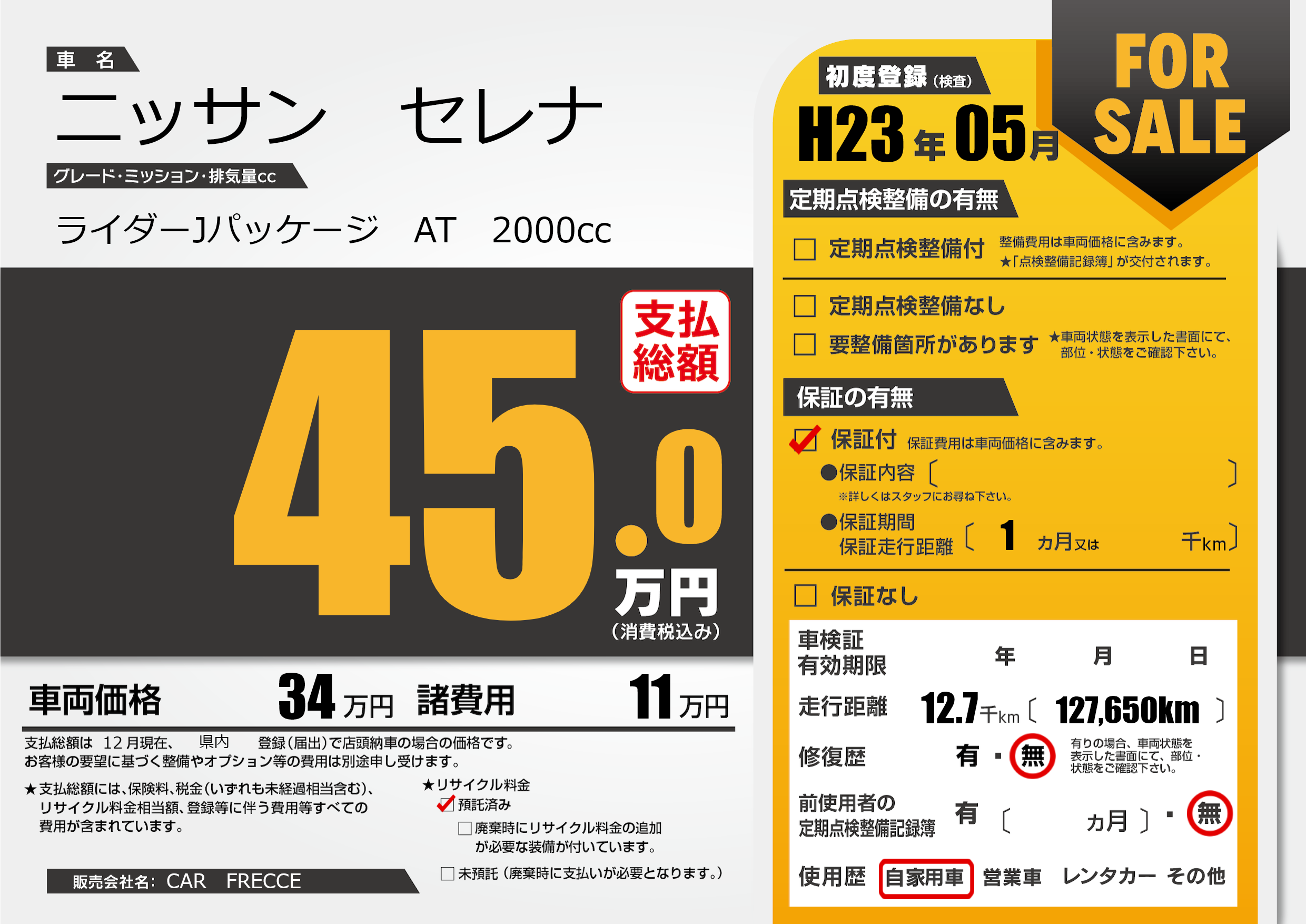 | 車名 | ニッサン セレナ | グレード ミッション 排気量 |