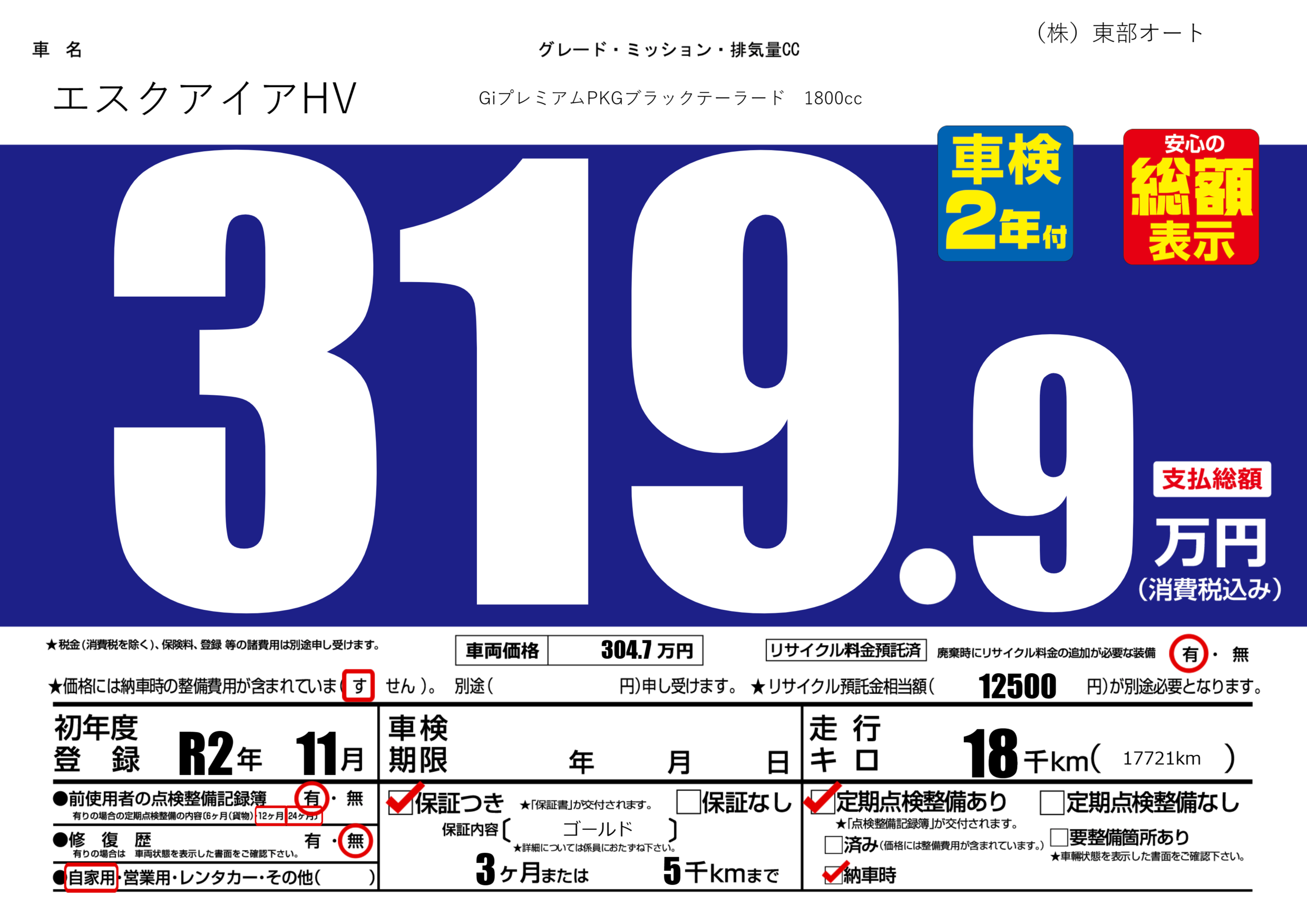 | 定期点検整備 | 定期点検整備あり 納車時あり | ||