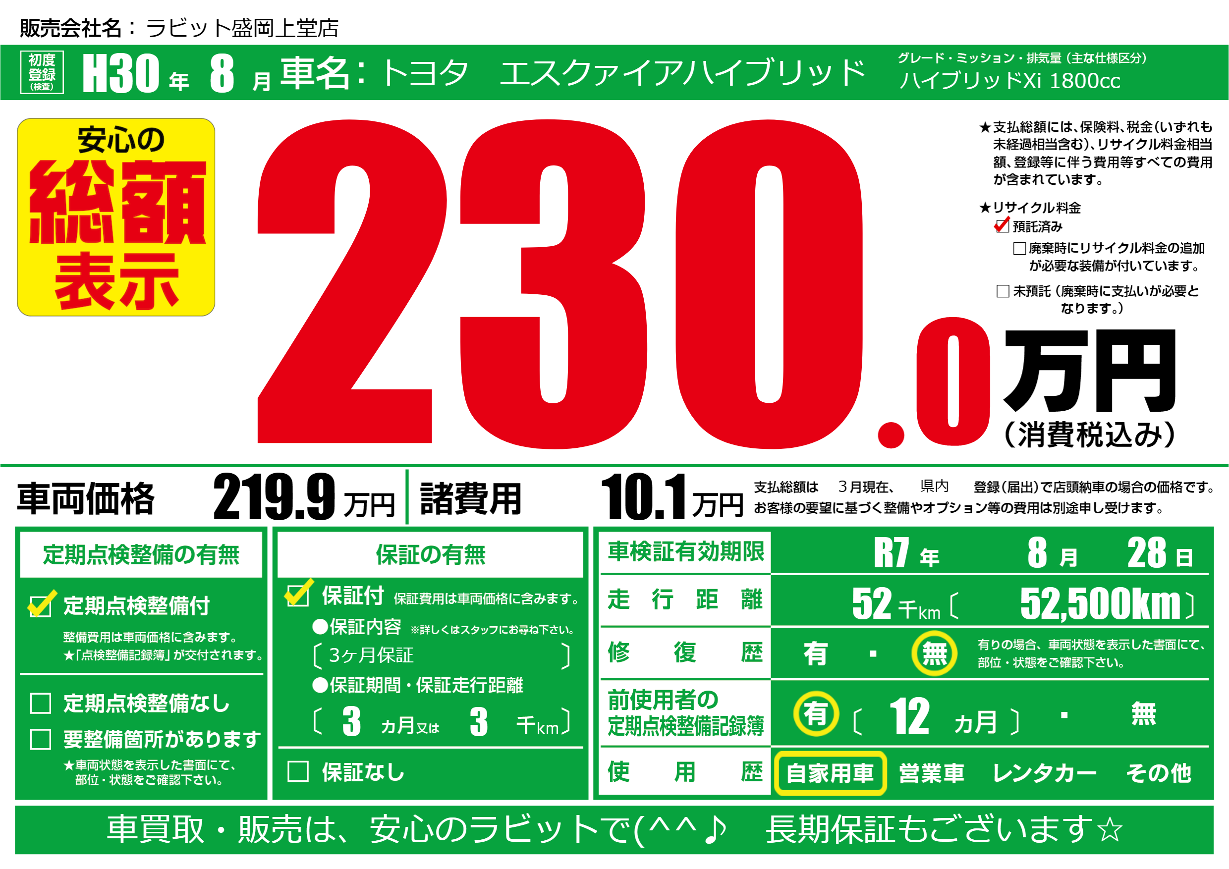 | 走行キロ | 5.2万km | 初年度登録 | H30年8月 |