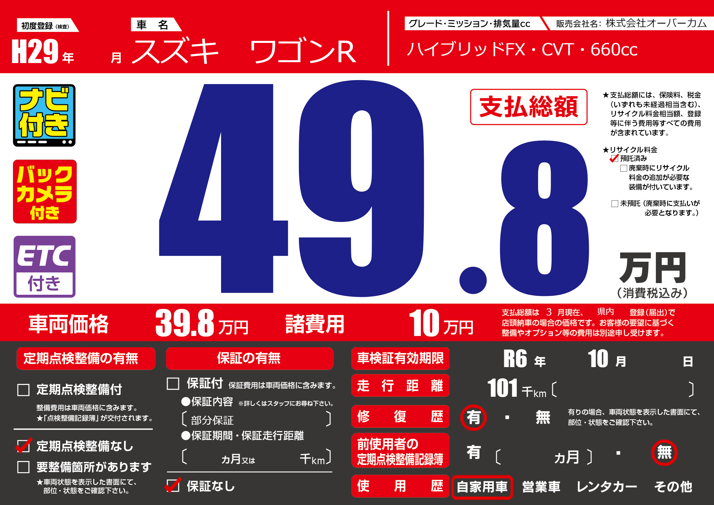 | 車名 | スズキ ワゴンR | グレード ミッション 排気量 |