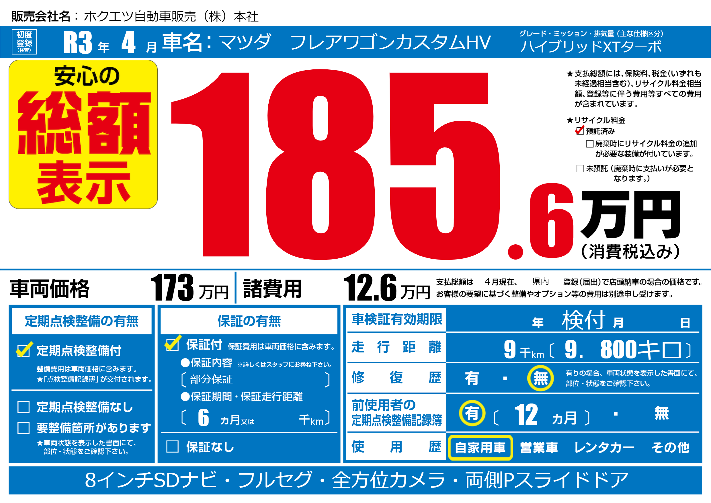 | 車名 | マツダ フレアワゴンカスタムHV | グレード ミッション 排気量 |