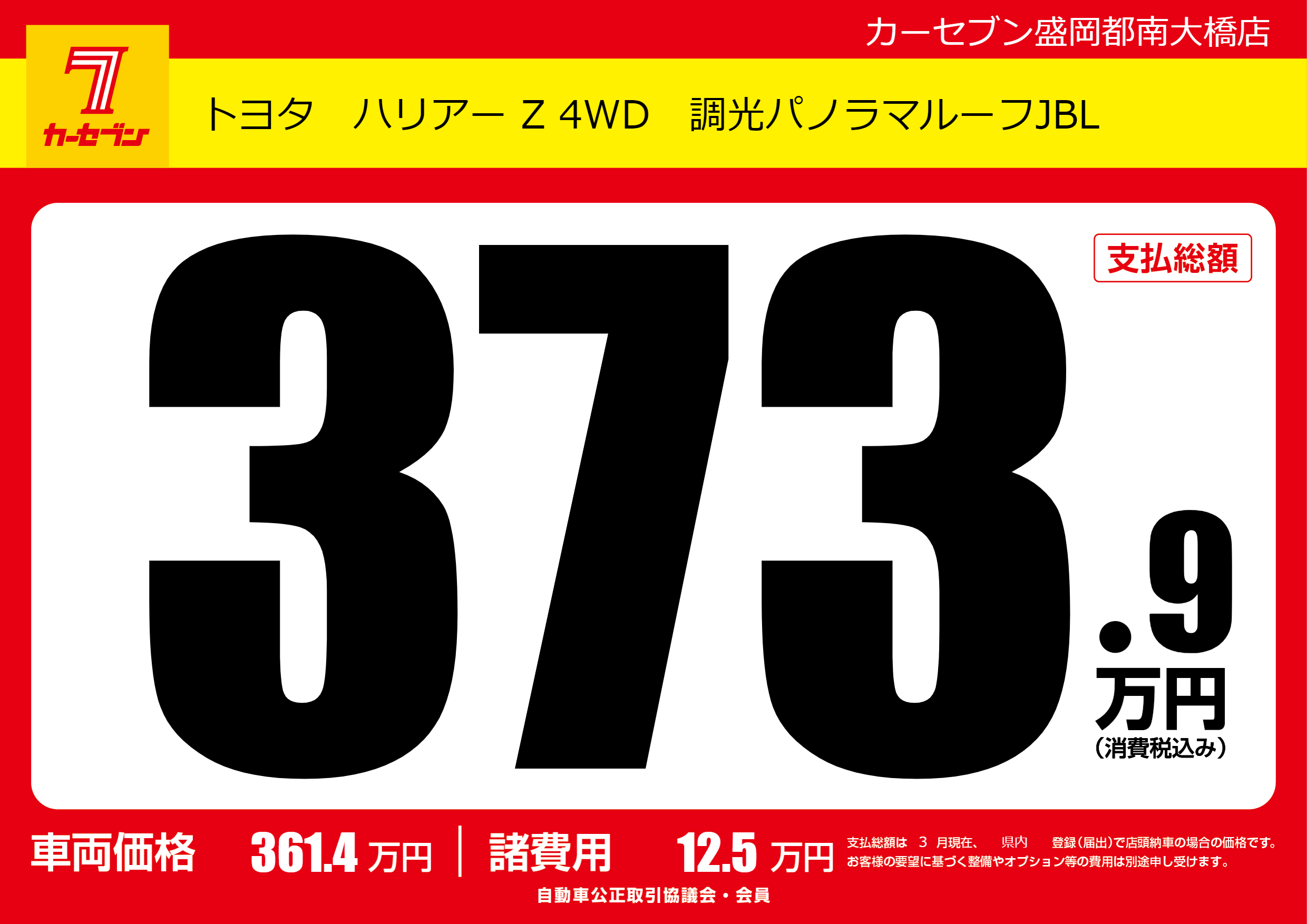 | 車名 | トヨタ ハリアー Z 4WD 調光パノラマルーフJBL | グレード ミッション 排気量 |