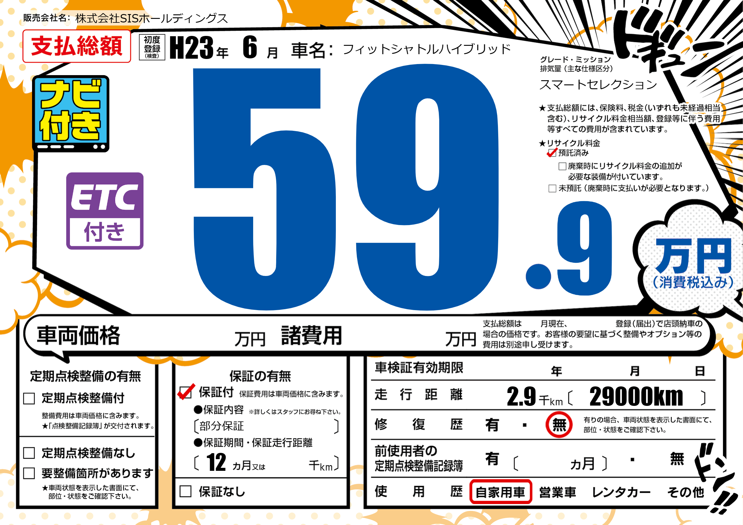 | 走行キロ | 0.2万km | 初年度登録 | H23年6月 |