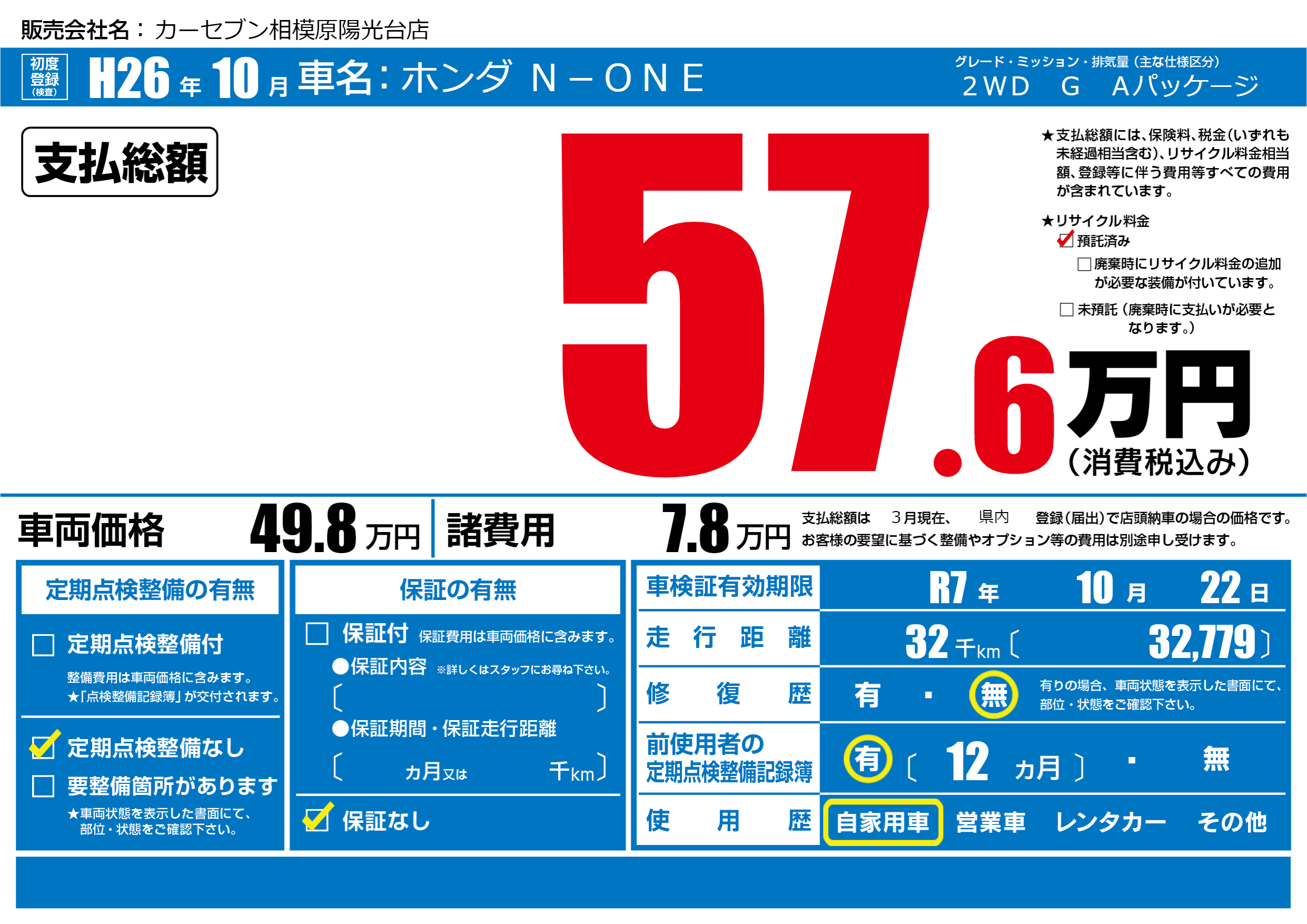 | 車名 | ホンダ N-ONE | グレード ミッション 排気量 |