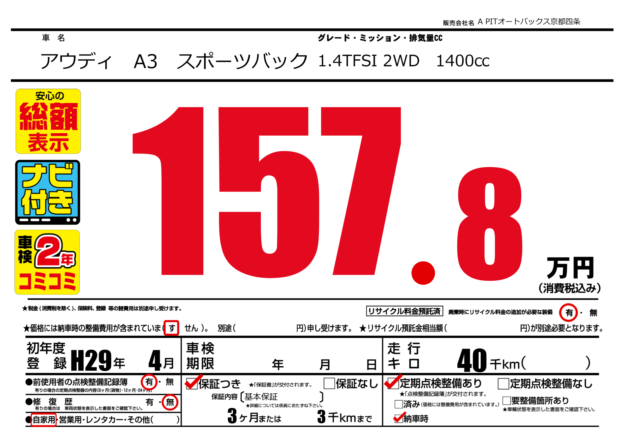 | 定期点検整備 | 定期点検整備あり 納車時あり | ||