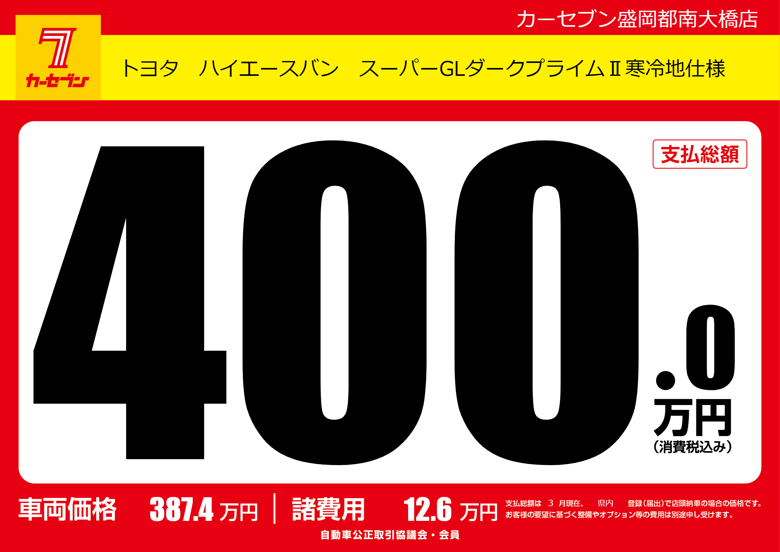 | 車名 | トヨタ ハイエースバン スーパーGLダークプライムⅡ寒冷地仕様 | グレード ミッション 排気量 |
