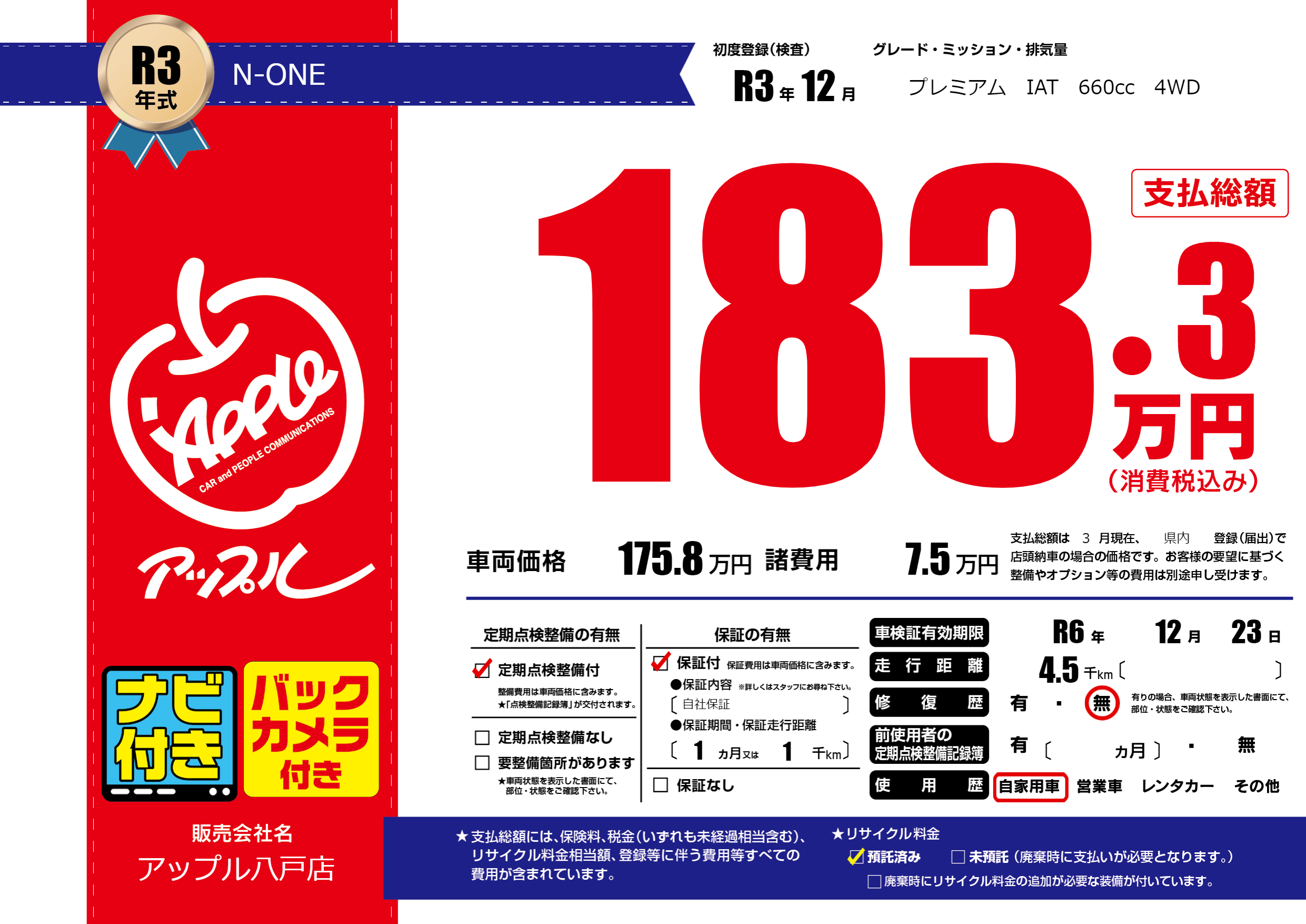 | 走行キロ | 0.4万km | 初年度登録 | R3年12月 |