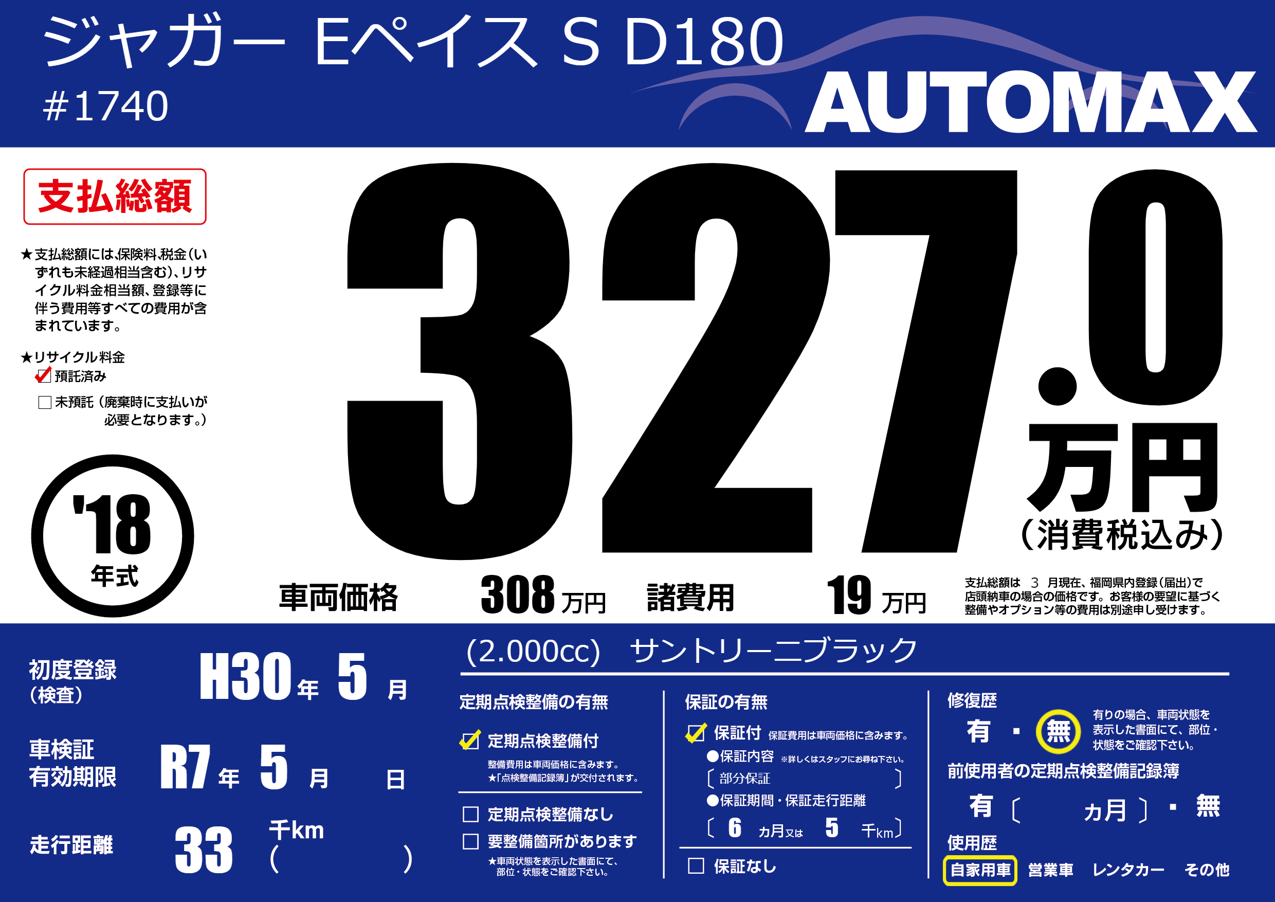 | 車名 | ジャガー Eペイス S D180 | グレード ミッション 排気量 |