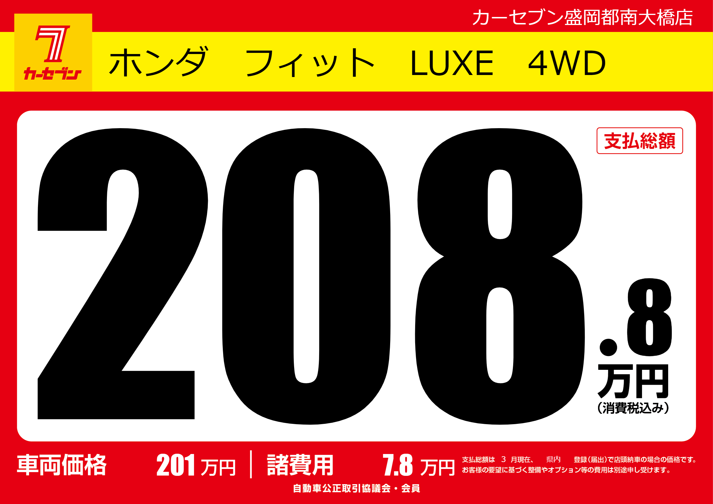 | 車名 | ホンダ フィット LUXE 4WD | グレード ミッション 排気量 |