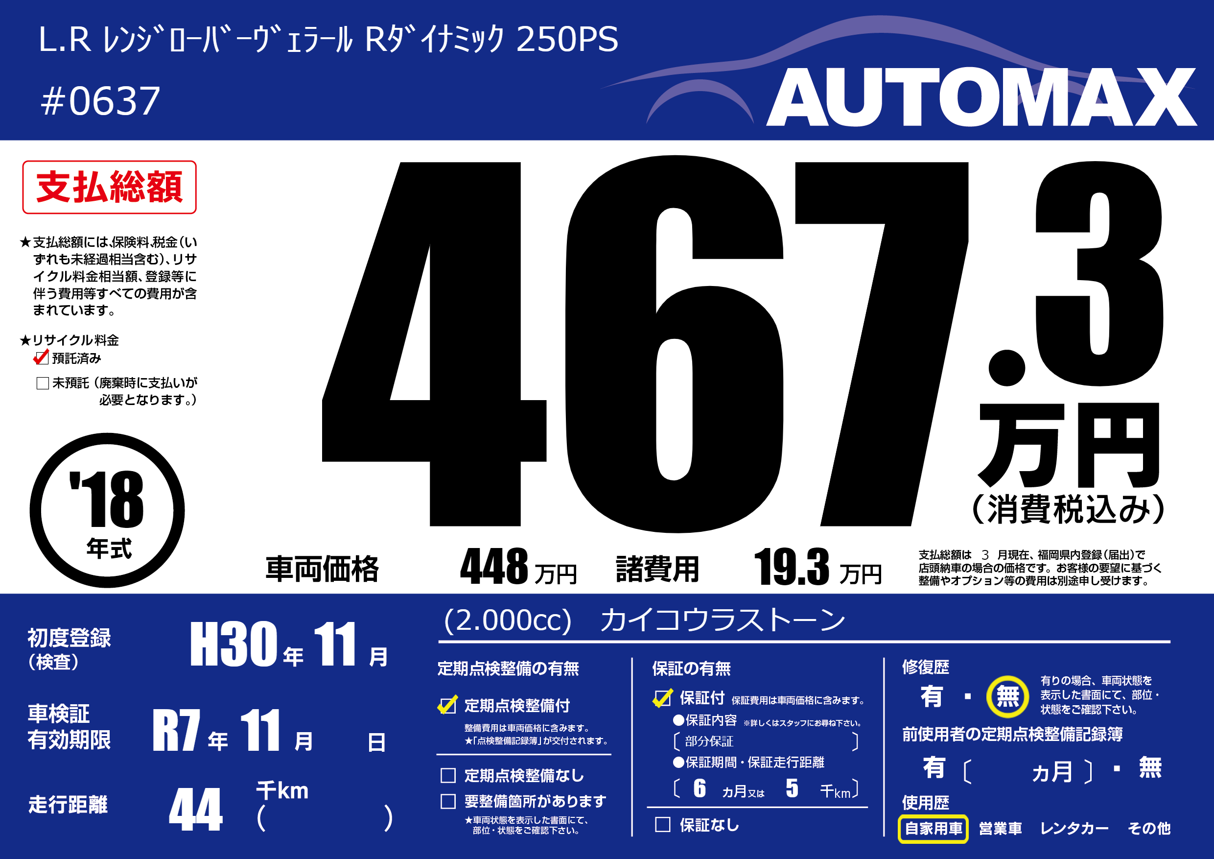 | 車名 | L.R レンジローバーヴェラール Rダイナミック 250PS | グレード ミッション 排気量 |