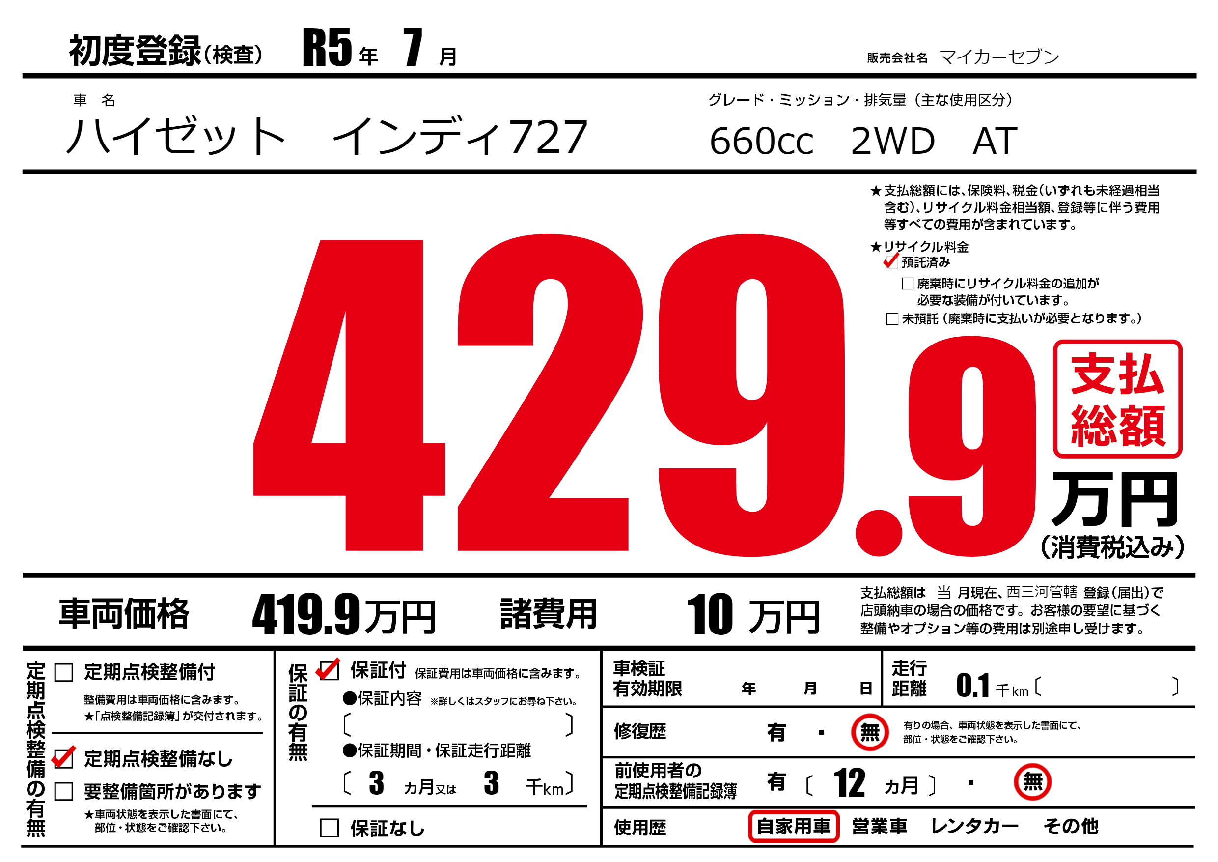 | 車名 | ハイゼット インディ727 | グレード ミッション 排気量 |