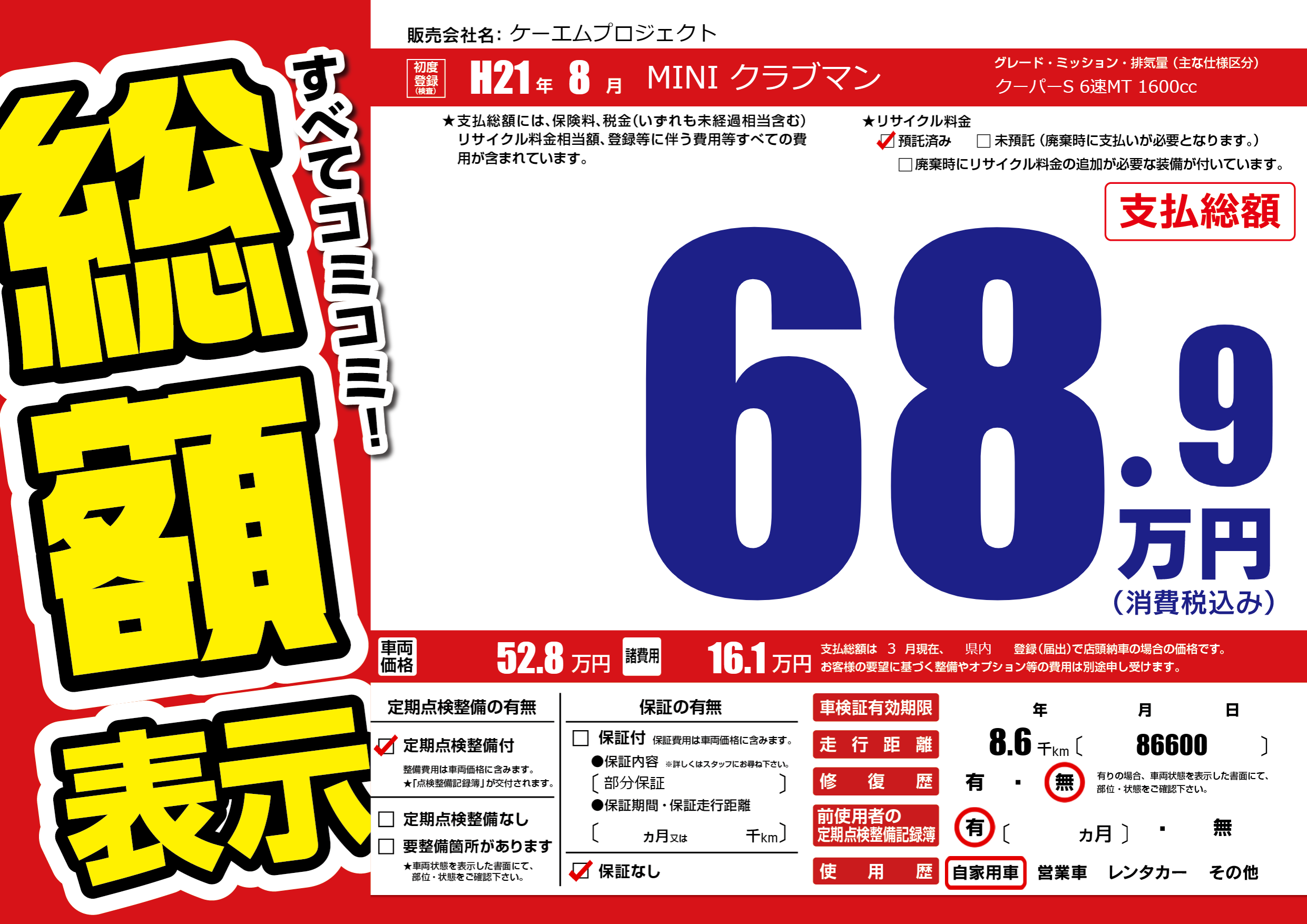 | 走行キロ | 0.8万km | 初年度登録 | H21年8月 |
