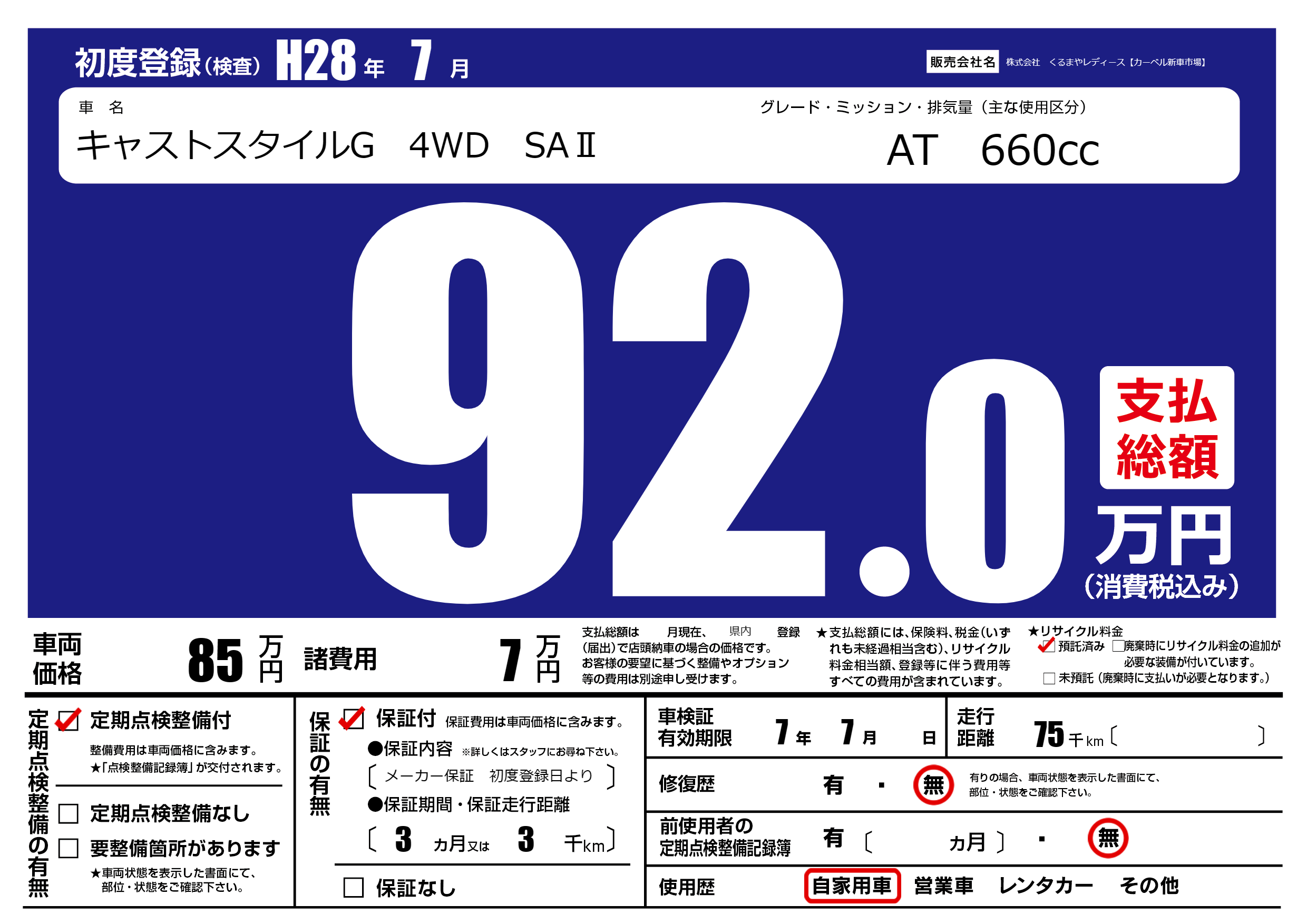 | 走行キロ | 7.5万km | 初年度登録 | H28年7月 |