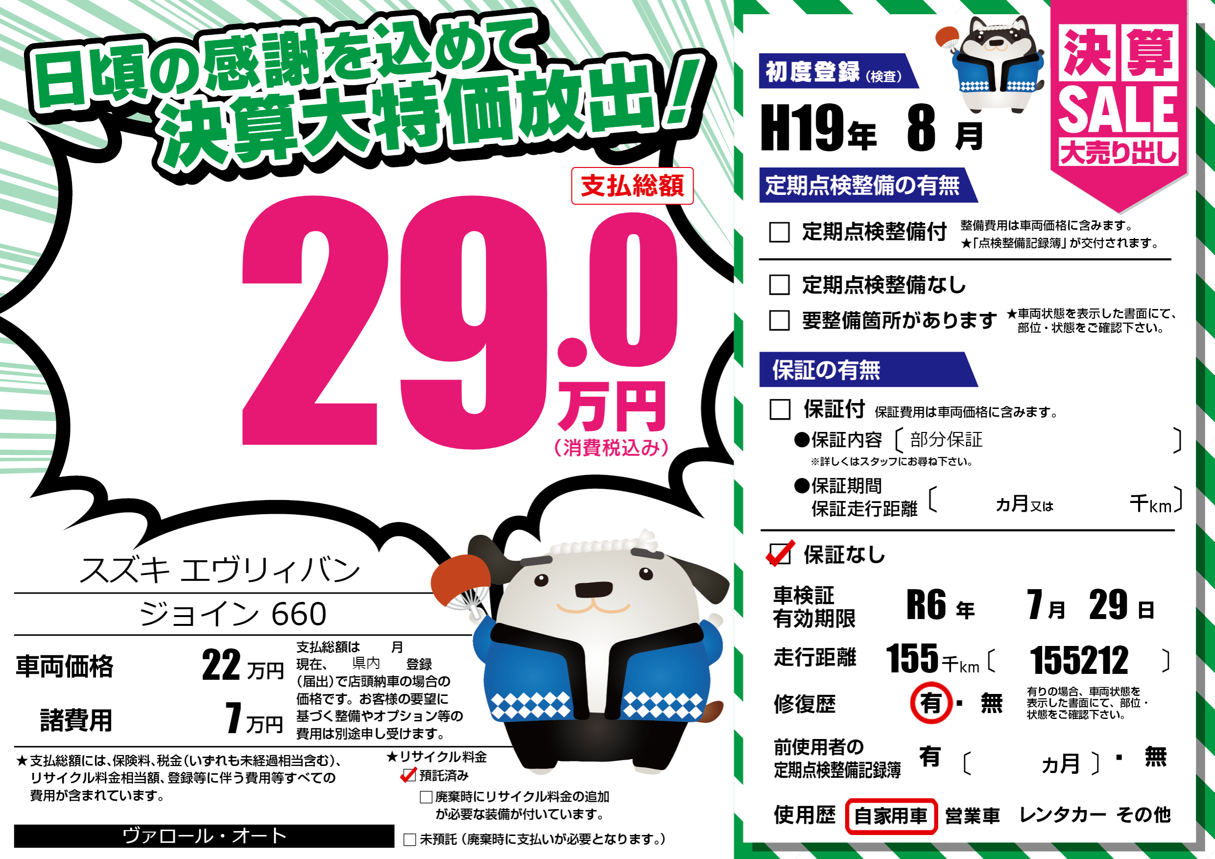 | 車名 | スズキ エヴリィバン | グレード ミッション 排気量 |