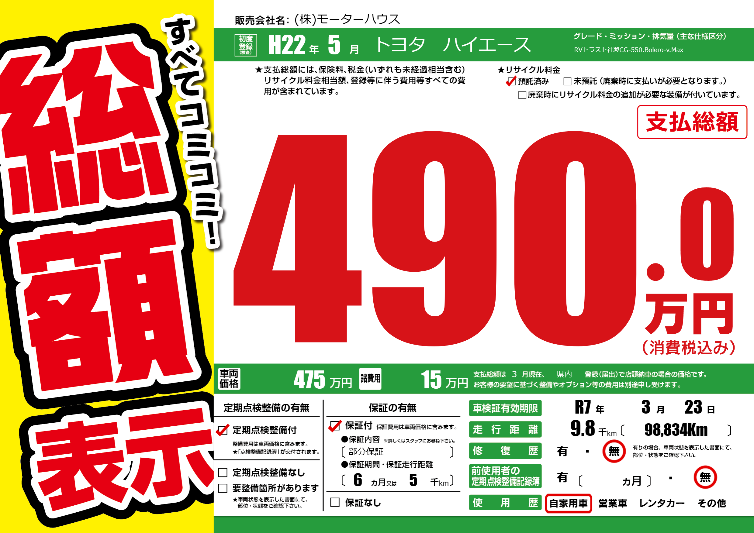 | 車名 | トヨタ ハイエース | グレード ミッション 排気量 |