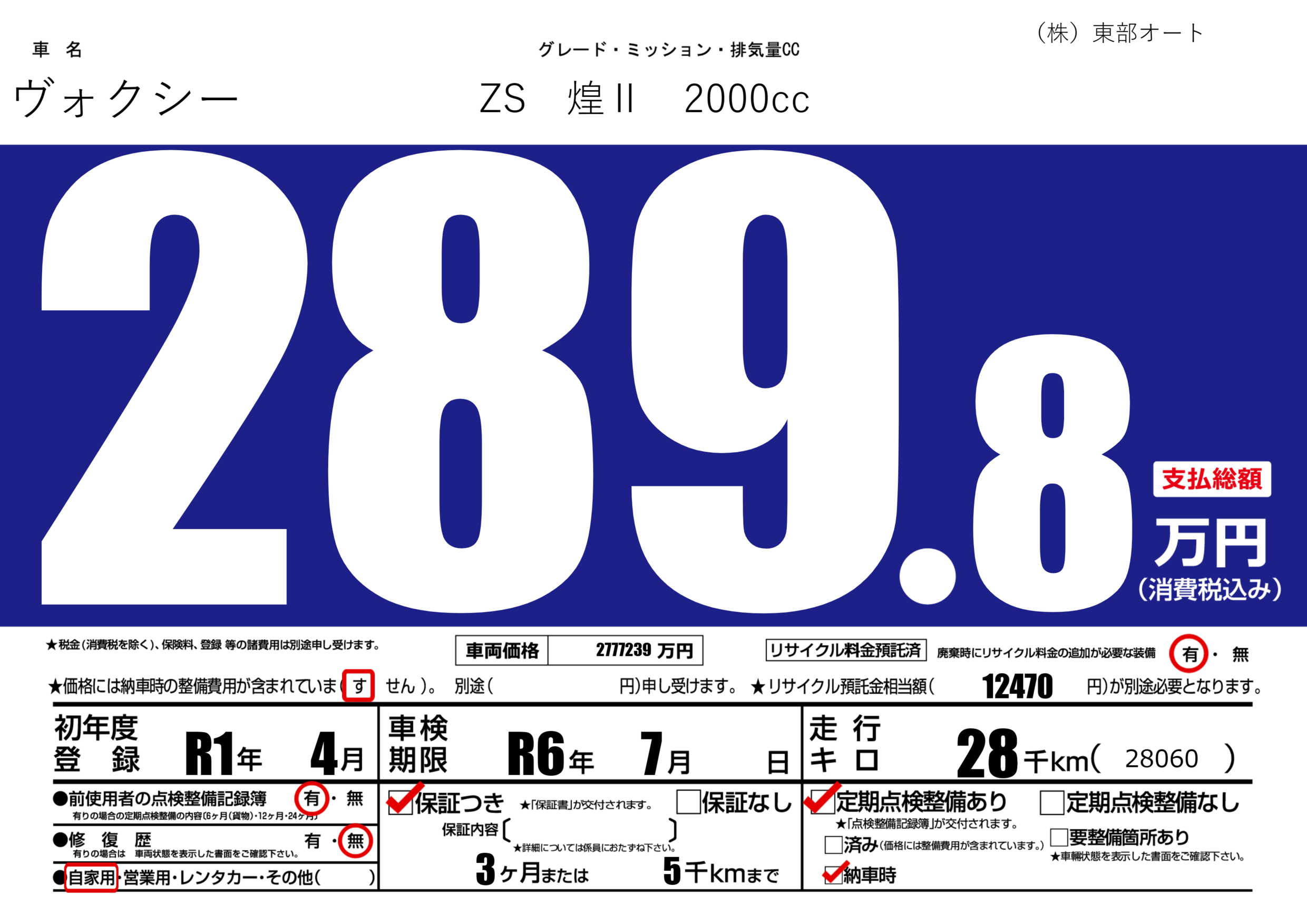 | 車名 | ヴォクシー | グレード ミッション 排気量 |