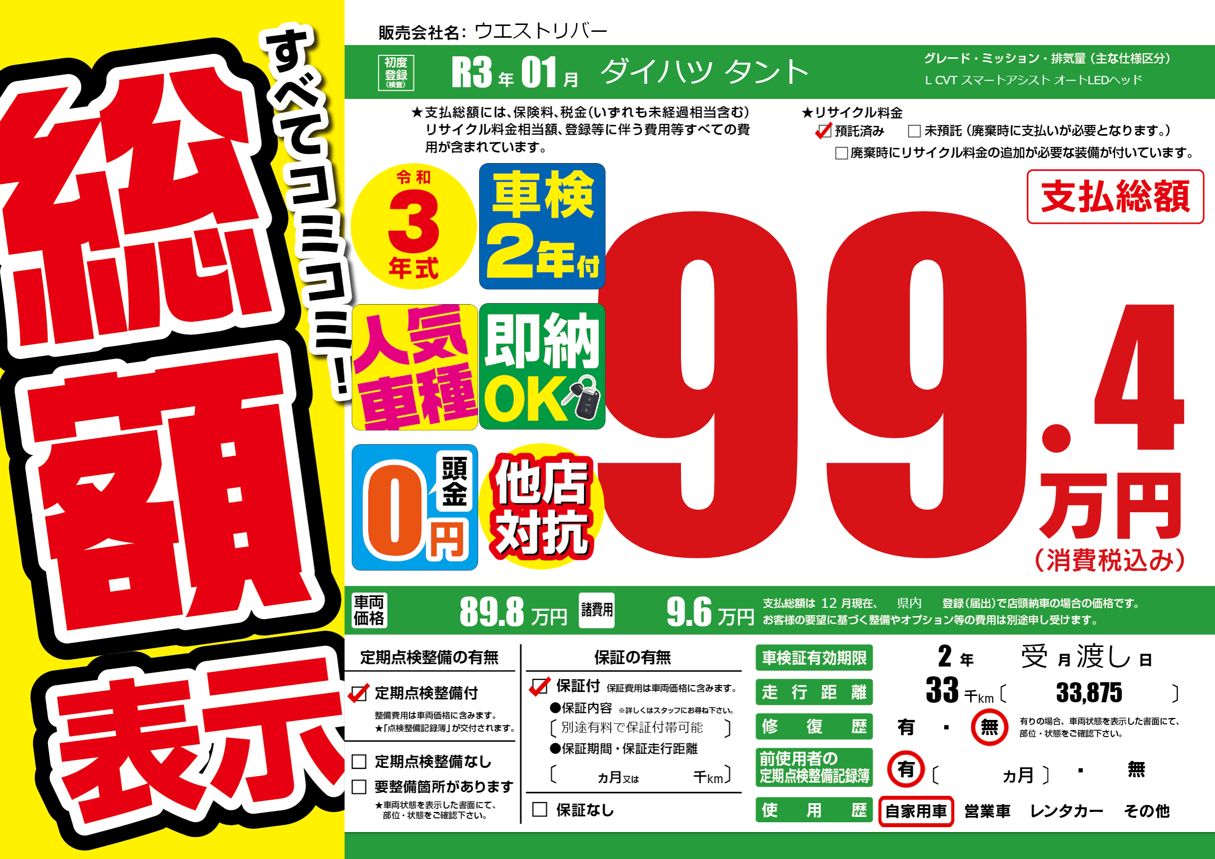 | 車名 | ダイハツ タント | グレード ミッション 排気量 |