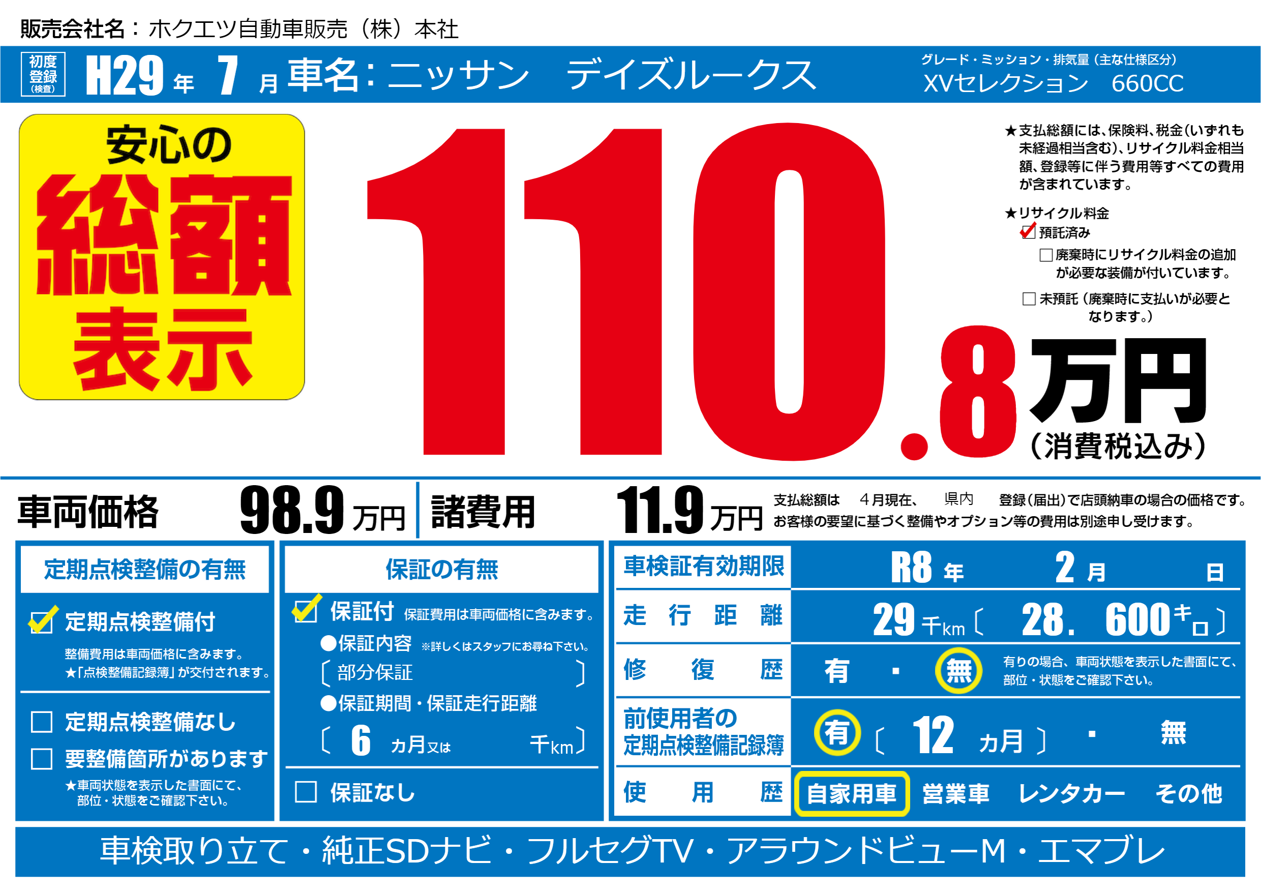 | 車名 | ニッサン デイズルークス | グレード ミッション 排気量 |