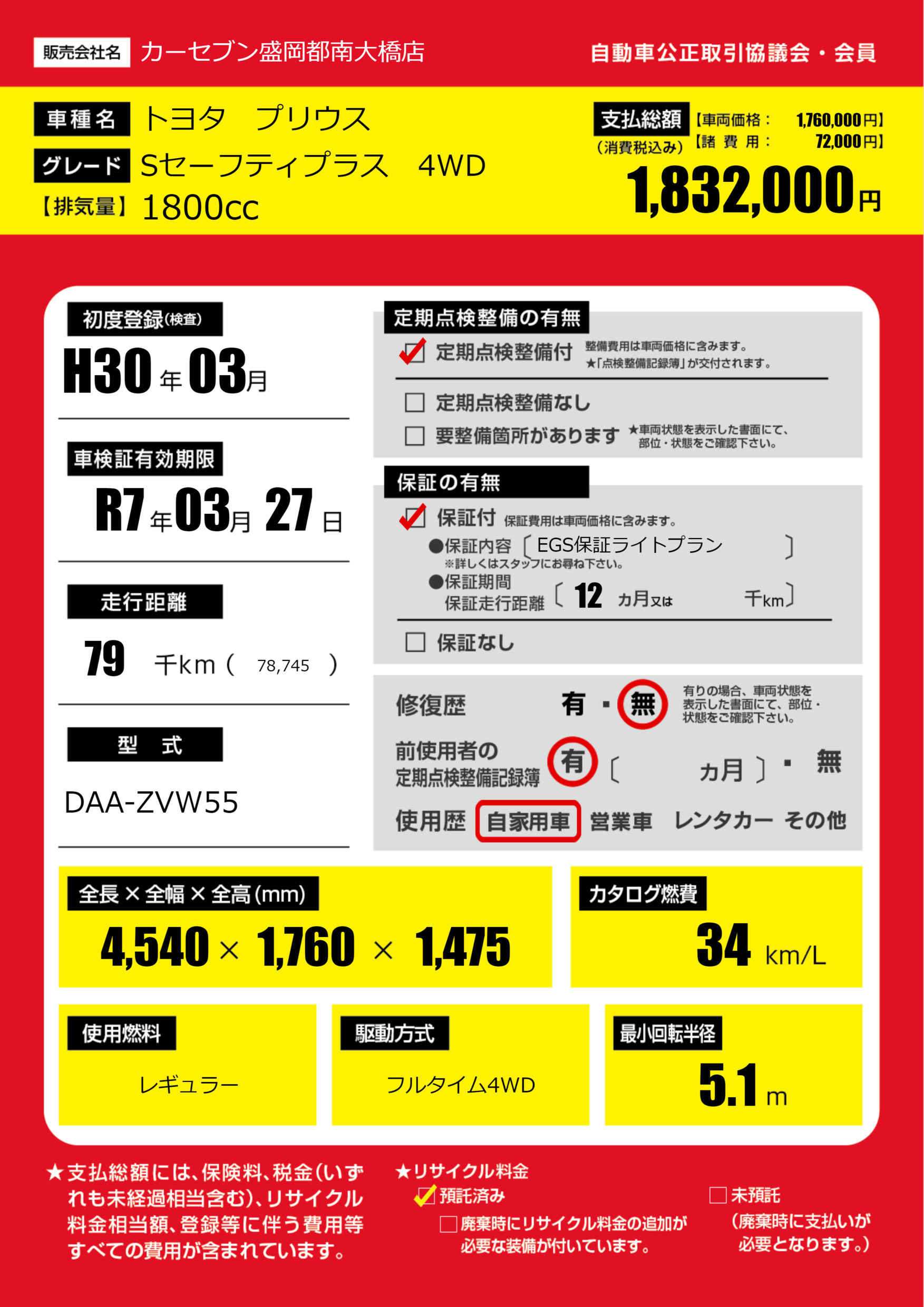 保証付き 保証内容(EGS保証ライトプラン) 12ヶ月または千km |