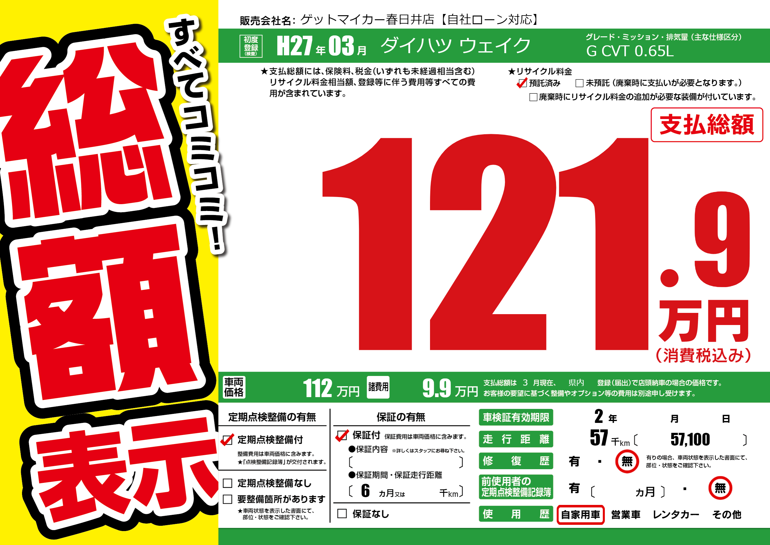 | 車名 | ダイハツ ウェイク | グレード ミッション 排気量 |