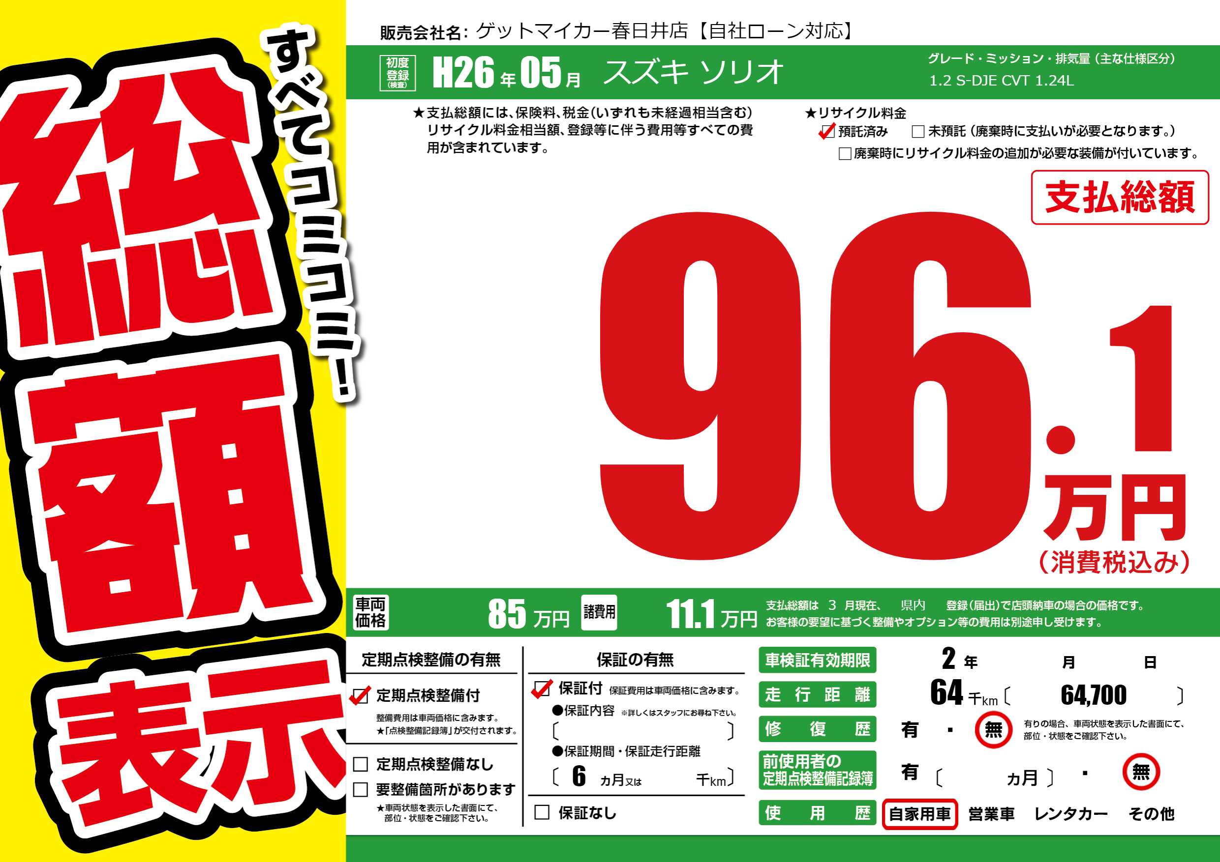 | 車名 | スズキ ソリオ | グレード ミッション 排気量 |