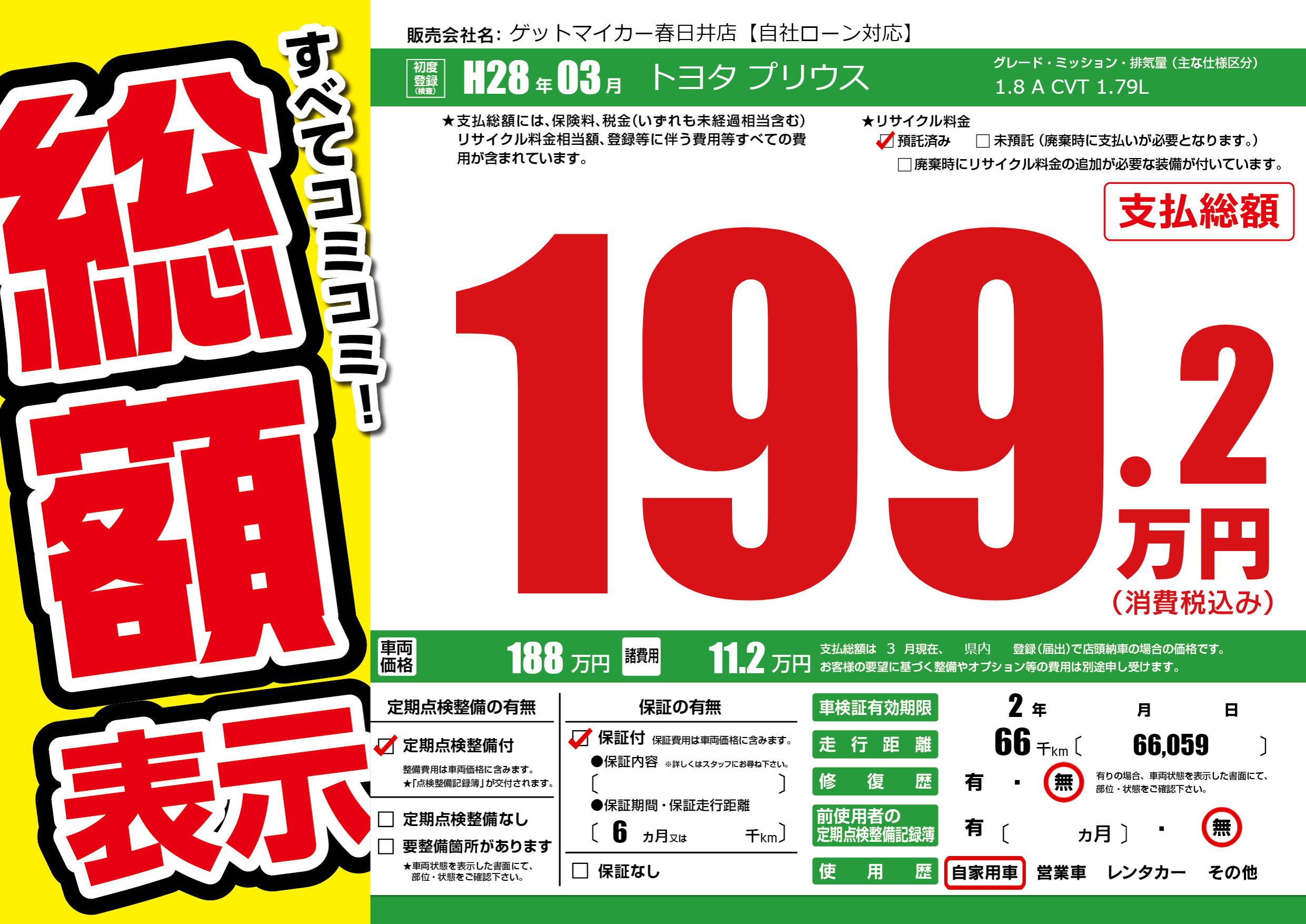 | 車名 | トヨタ プリウス | グレード ミッション 排気量 |