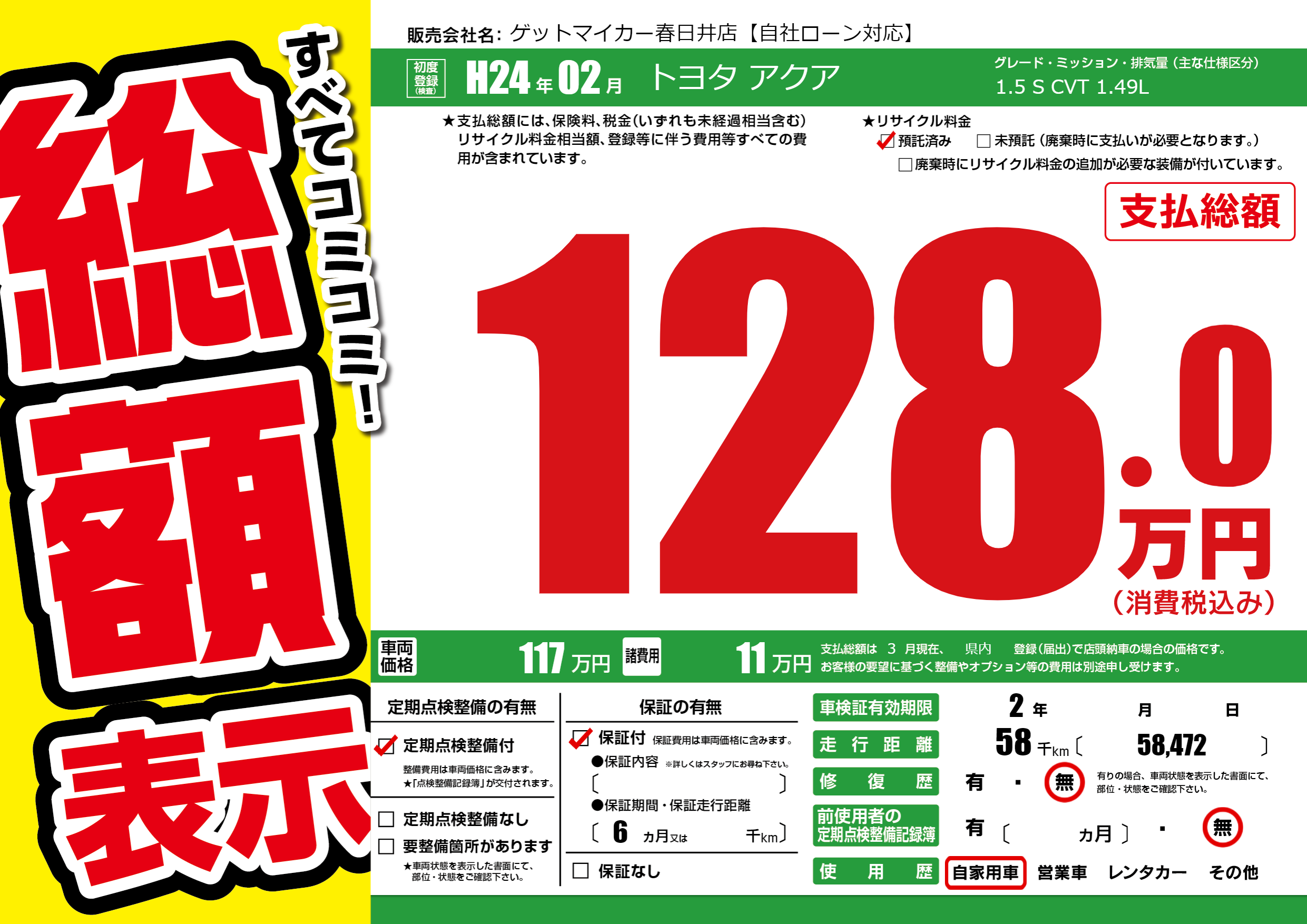 | 車名 | トヨタ アクア | グレード ミッション 排気量 |