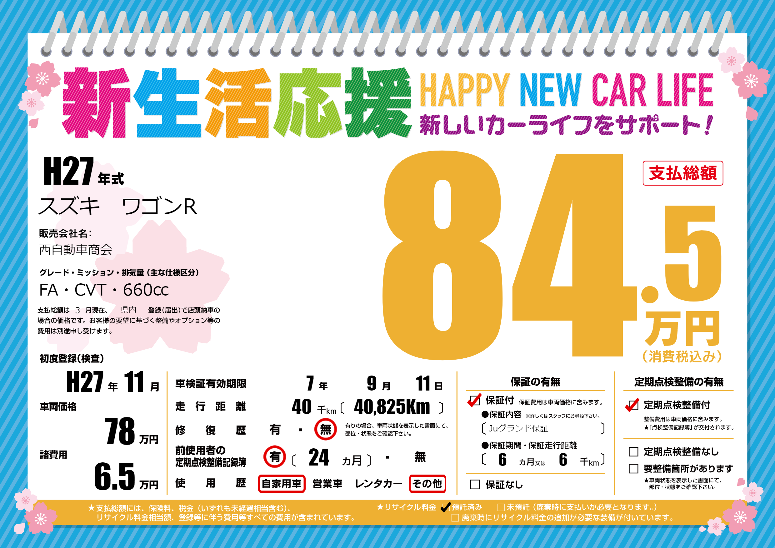 | 走行キロ | 4万km | 初年度登録 | H27年11月 |