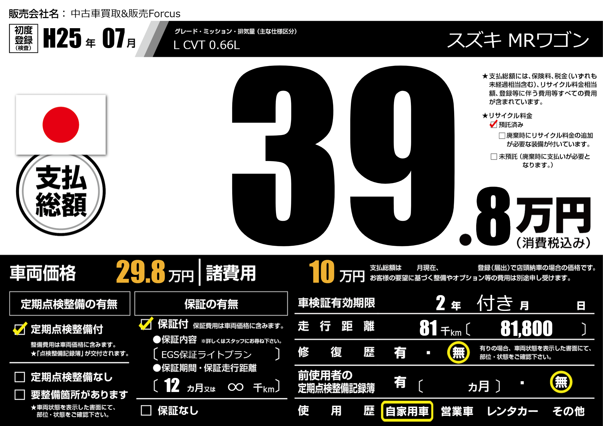 | 車名 | スズキ MRワゴン | グレード ミッション 排気量 |