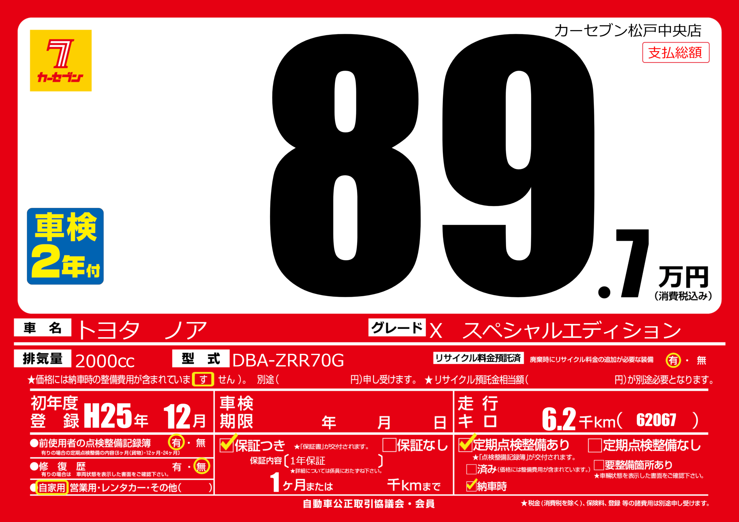 | 定期点検整備 | 定期点検整備あり 納車時あり | ||
