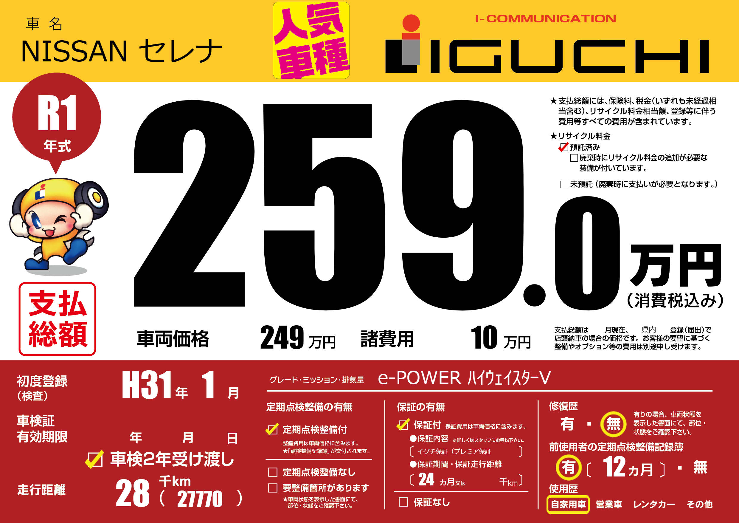 | 車名 | NISSAN セレナ | グレード ミッション 排気量 |