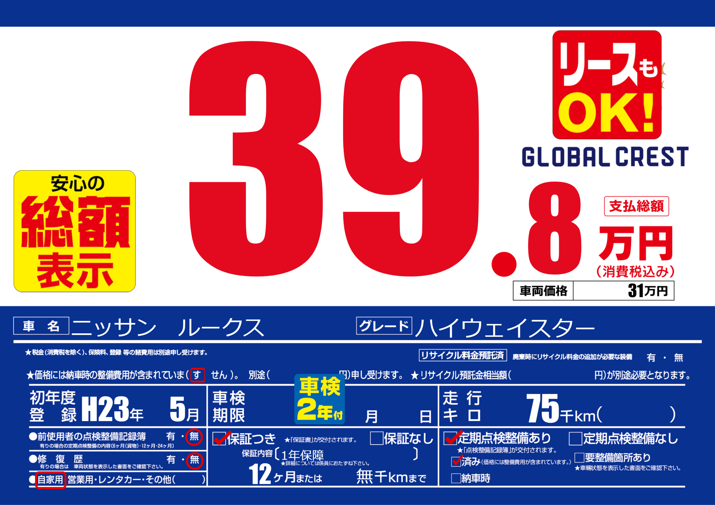 | 定期点検整備 | 定期点検整備あり 定期点検整備済み | ||