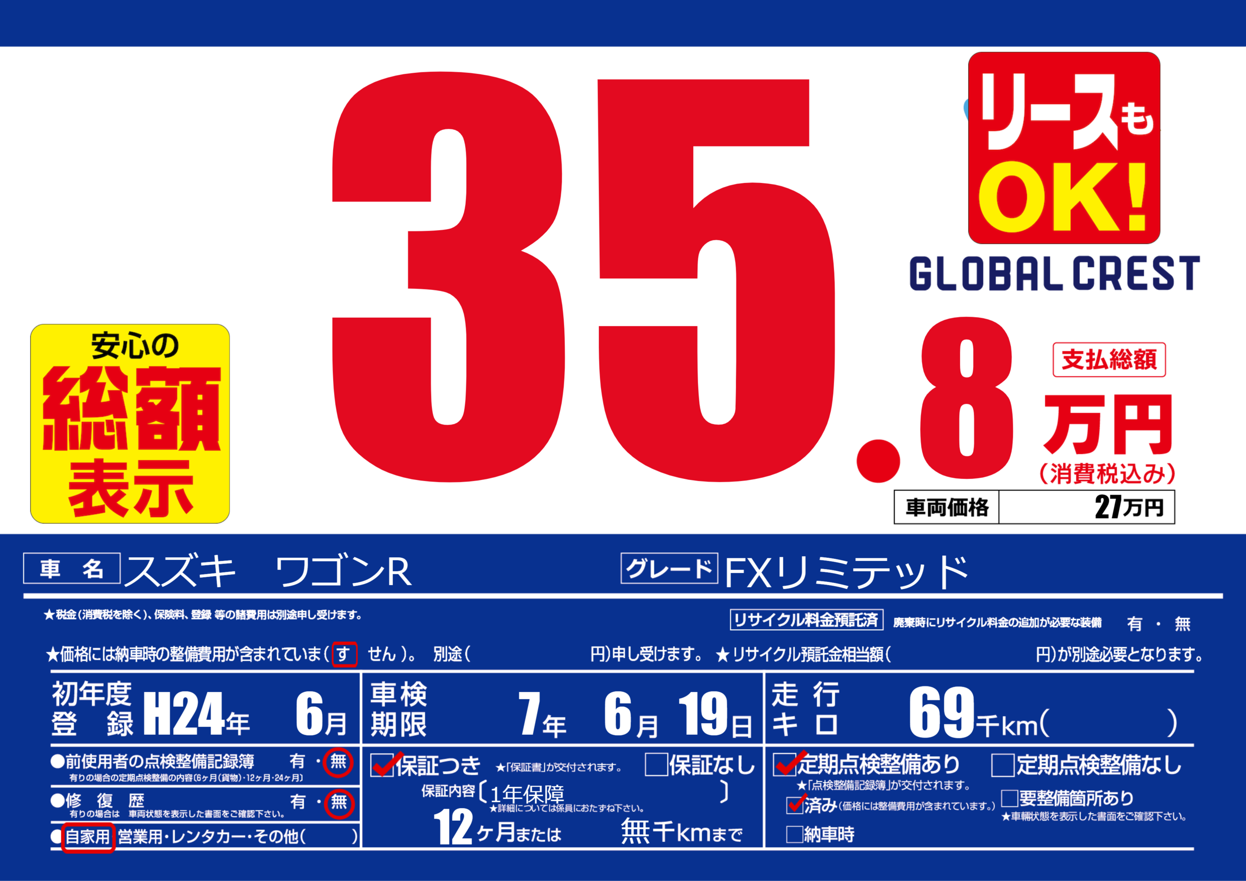 | 車名 | スズキ ワゴンR | グレード ミッション 排気量 |
