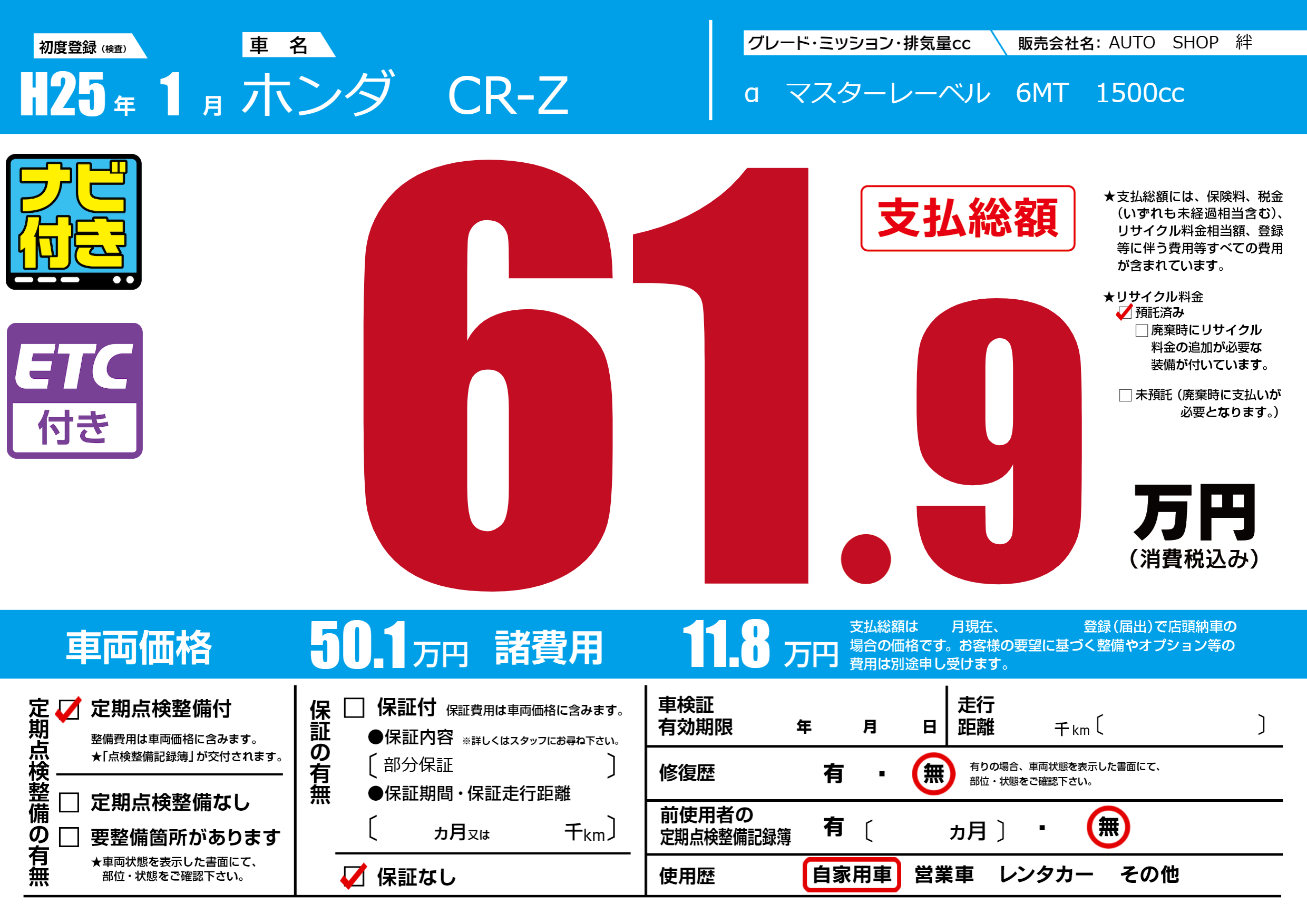 | 車名 | ホンダ CR-Z | グレード ミッション 排気量 |