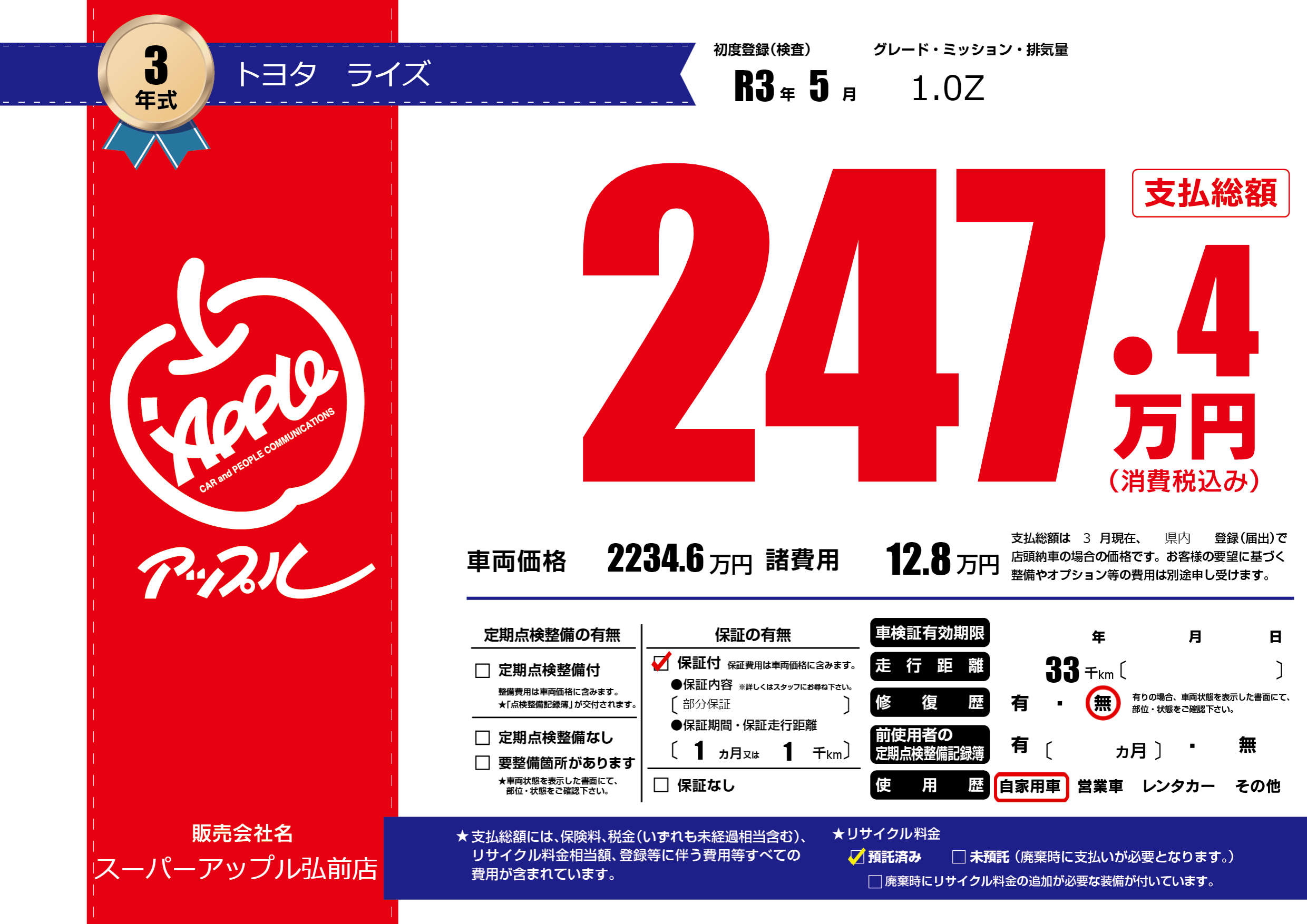 | 走行キロ | 3.3万km | 初年度登録 | R3年5月 |