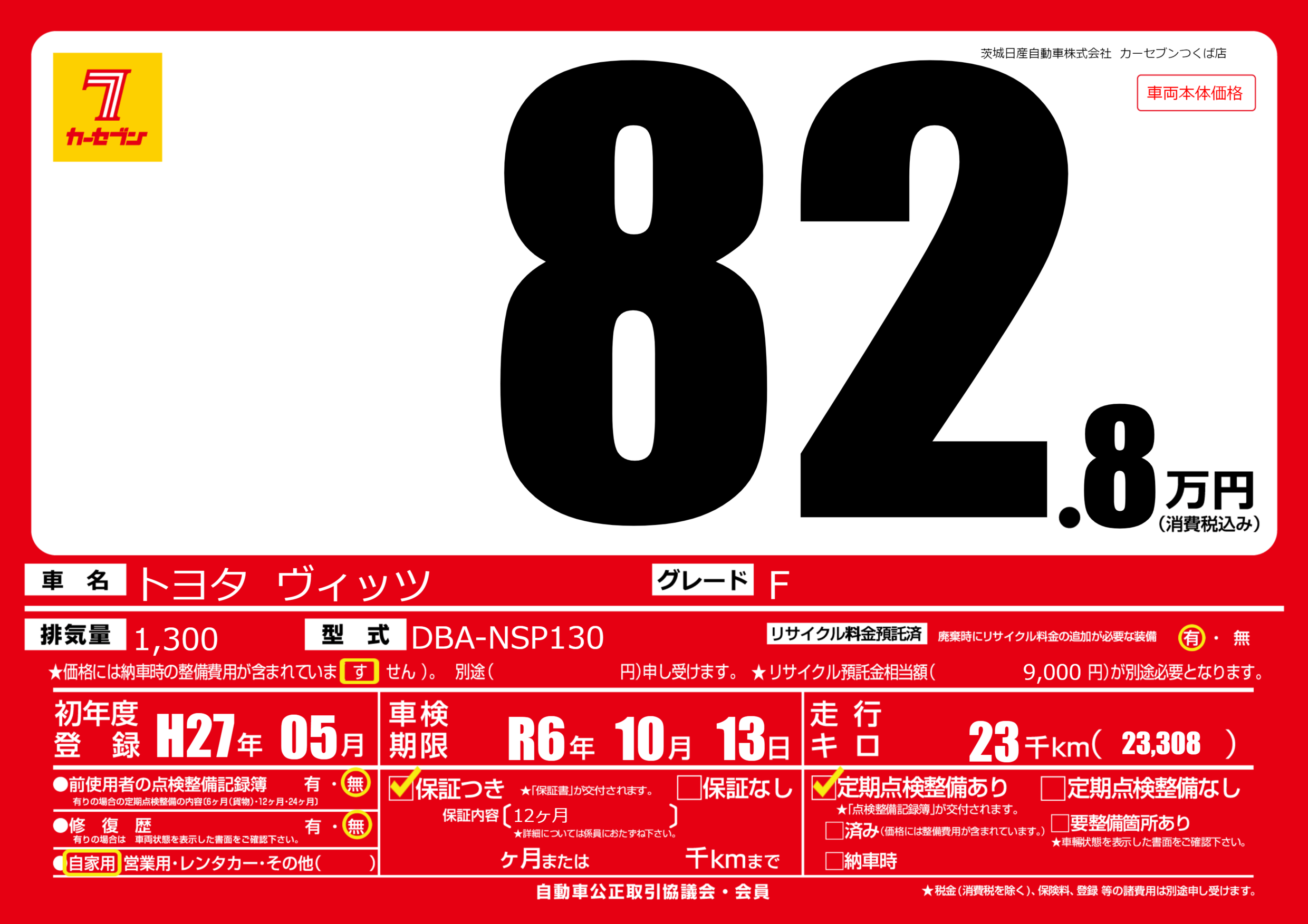 | 車名 | トヨタ ヴィッツ | グレード ミッション 排気量 |