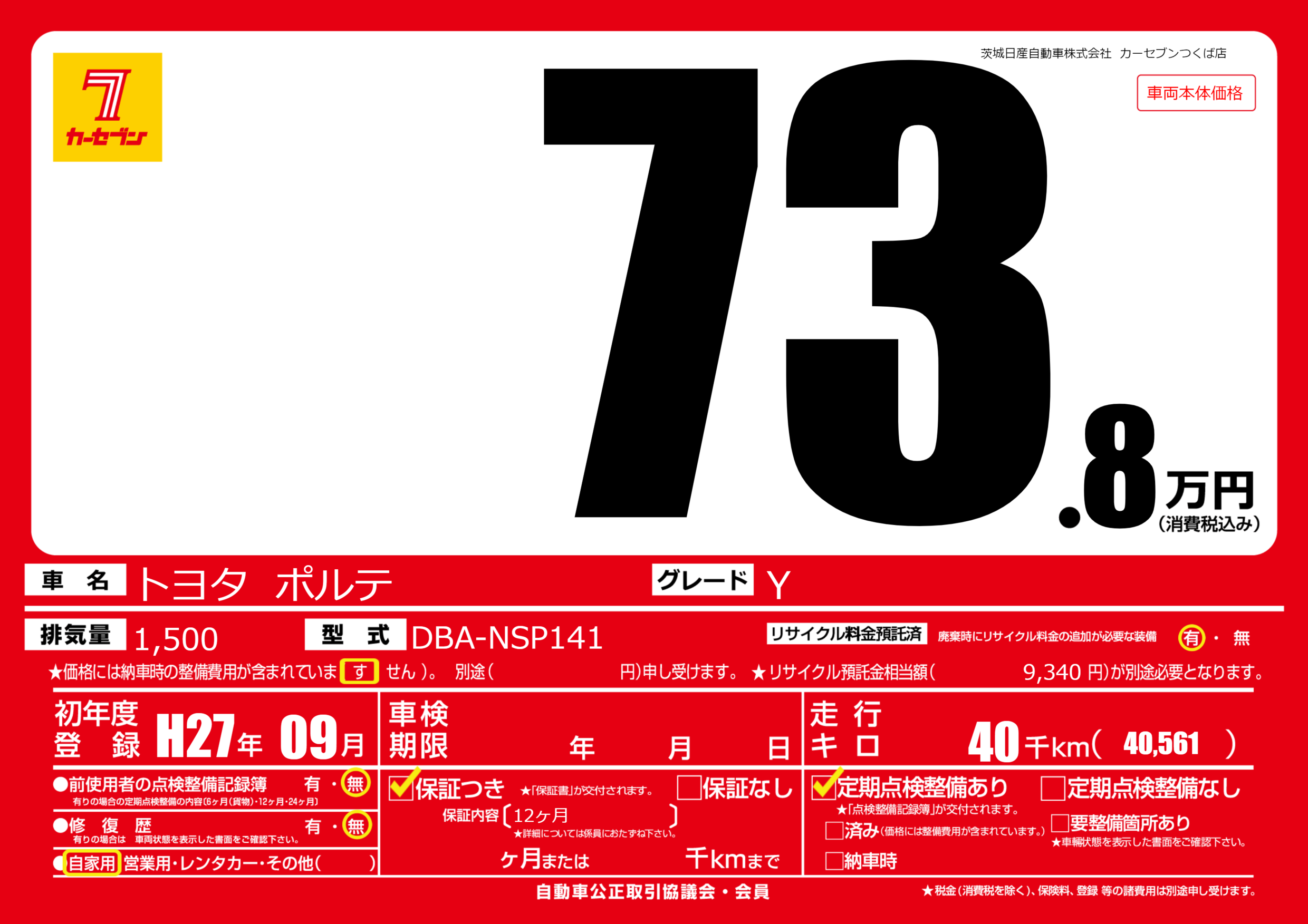 | 車名 | トヨタ ポルテ | グレード ミッション 排気量 |