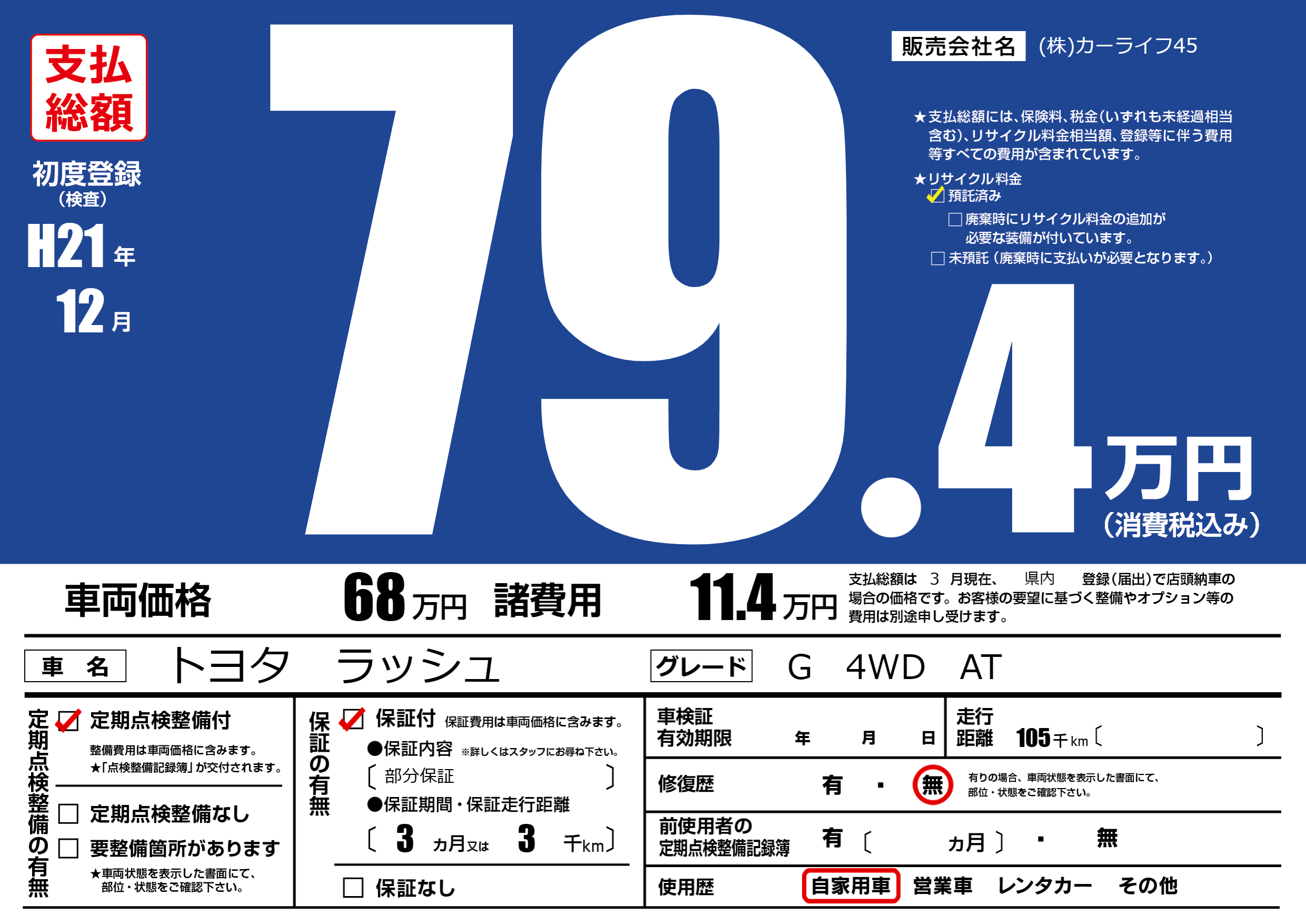| 走行キロ | 10.5万km | 初年度登録 | H21年12月 |