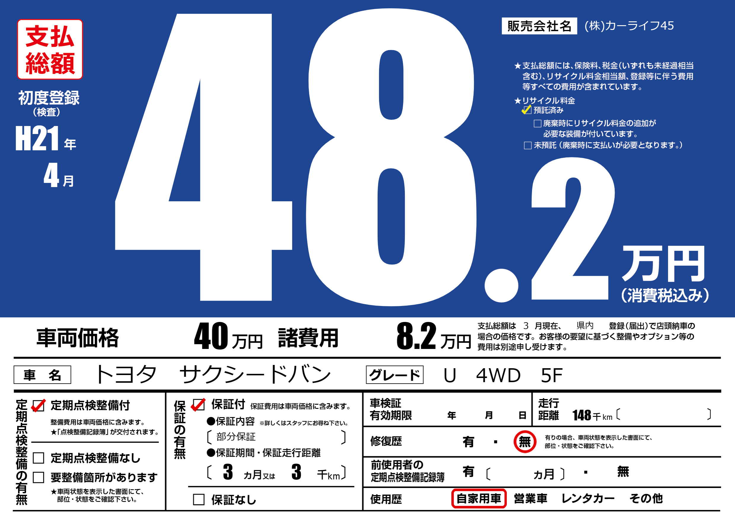 | 走行キロ | 14.8万km | 初年度登録 | H21年4月 |