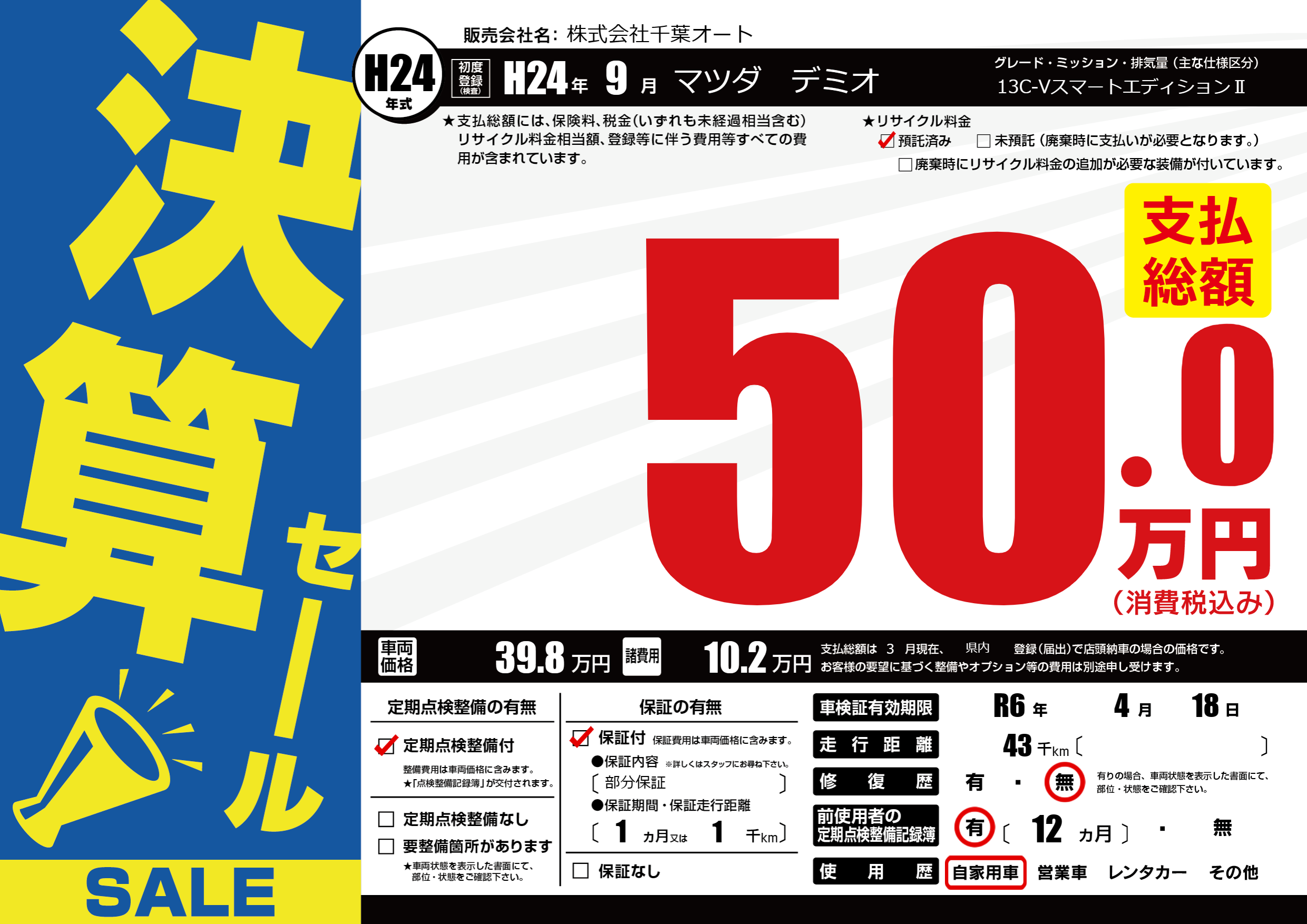 | 車名 | マツダ デミオ | グレード ミッション 排気量 |