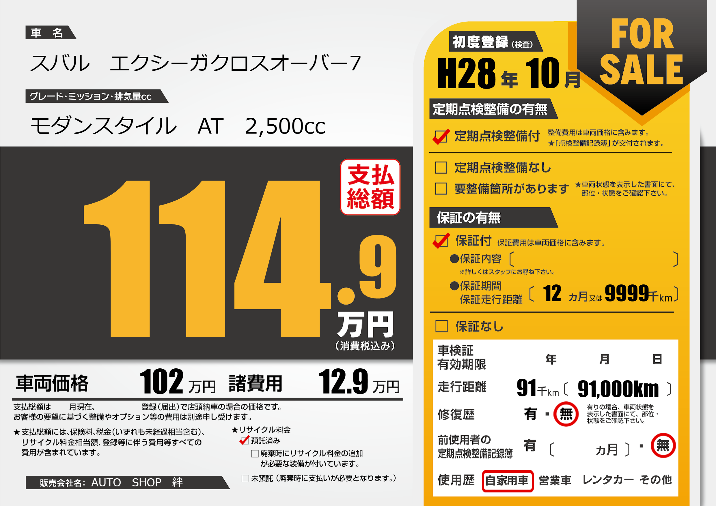 | 車名 | スバル エクシーガクロスオーバー7 | グレード ミッション 排気量 |