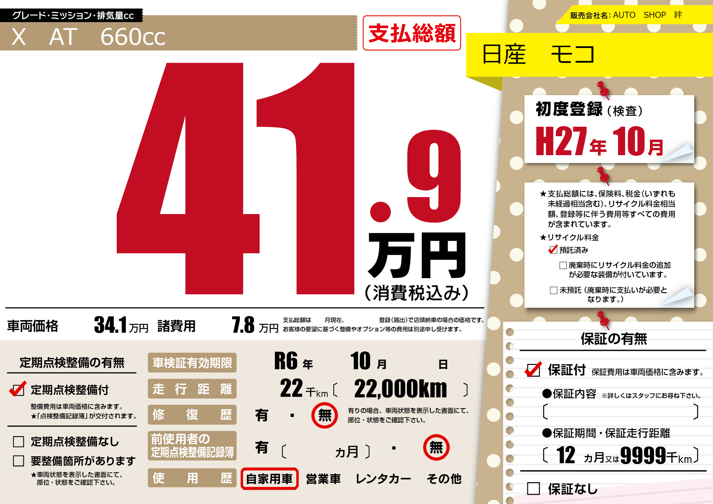 保証付き 保証内容(---) 12ヶ月または(9999)千kmまで |