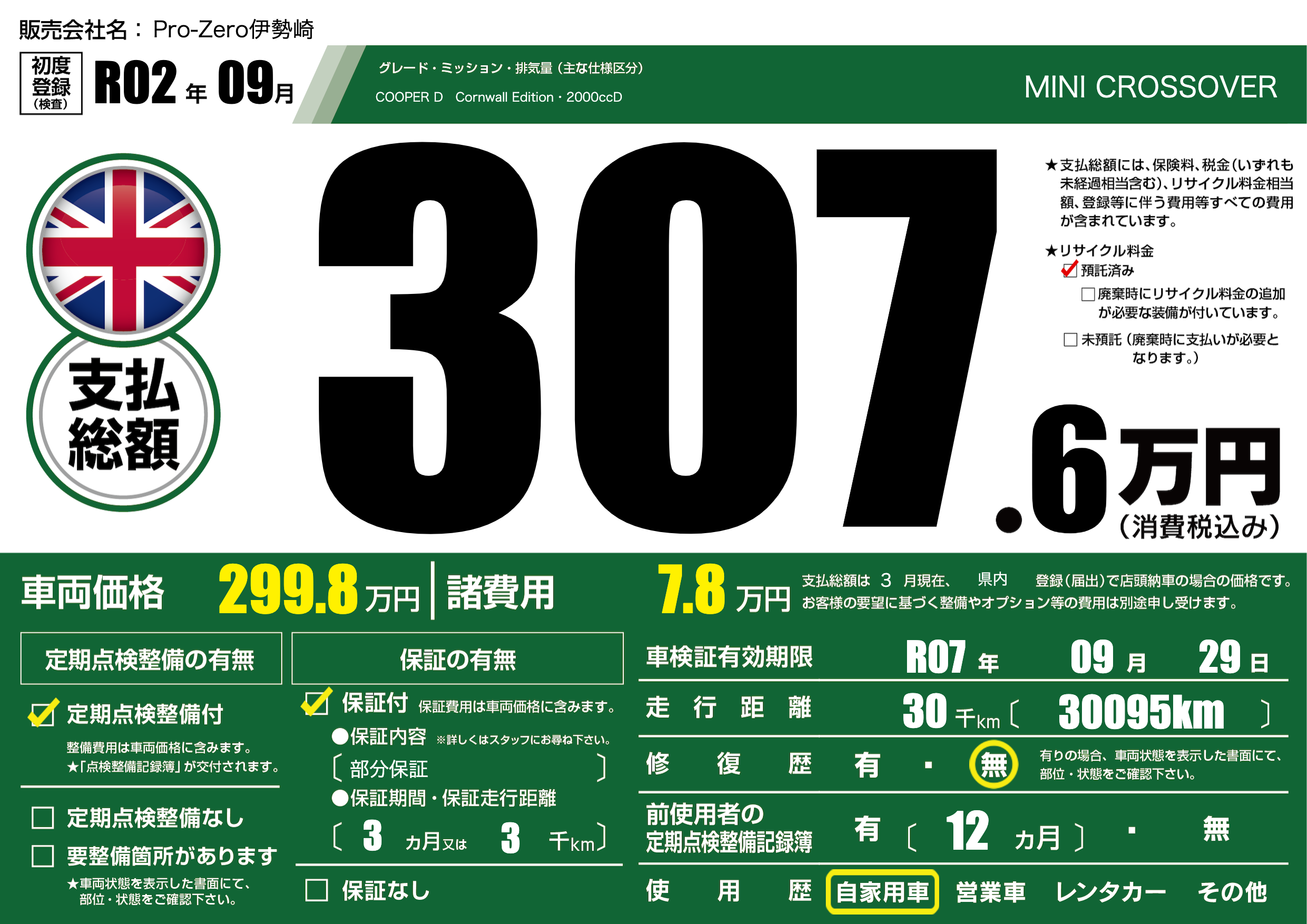| 走行キロ | 3万km | 初年度登録 | R02年09月 |