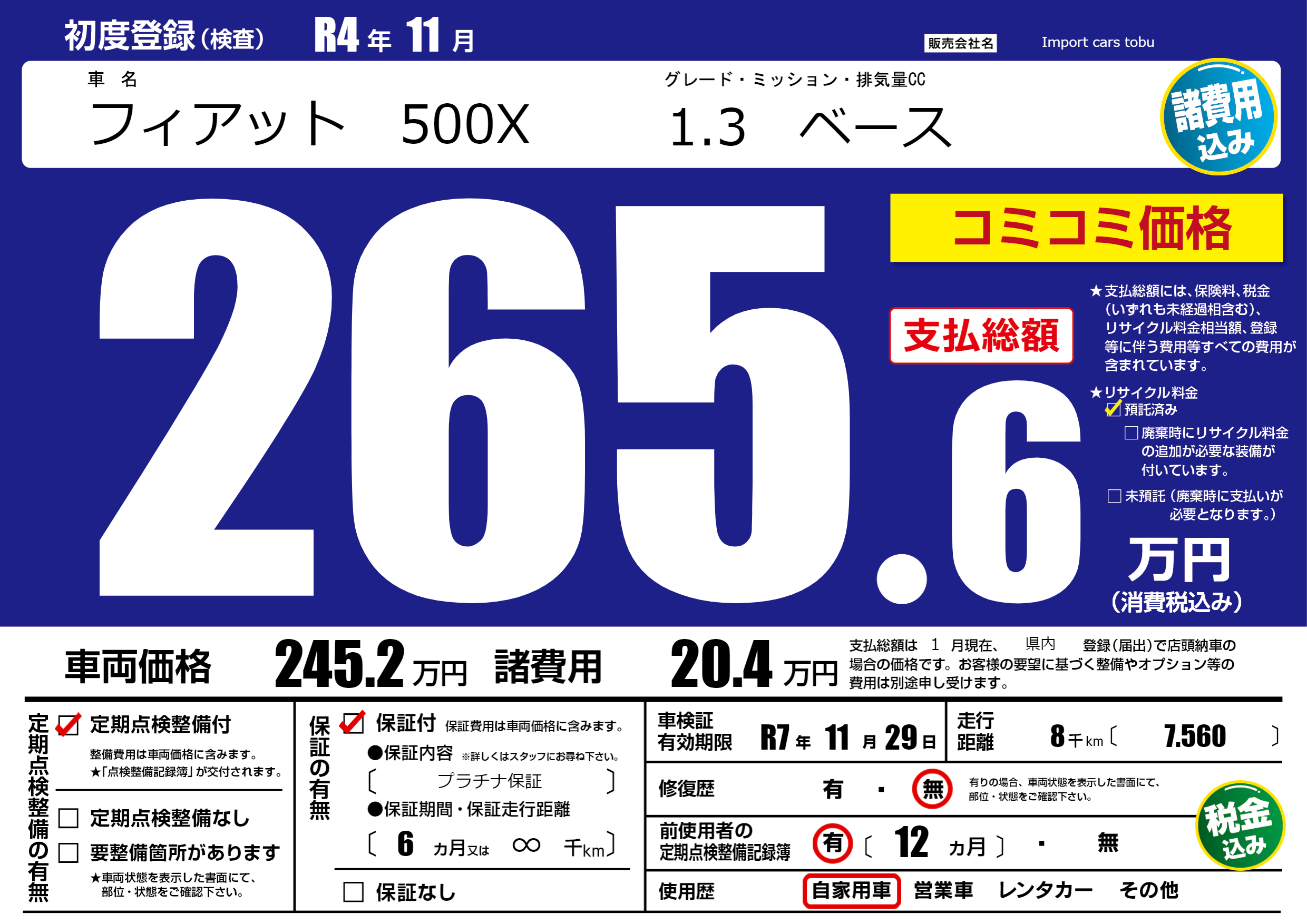 | 車名 | フィアット 500X | グレード ミッション 排気量 |