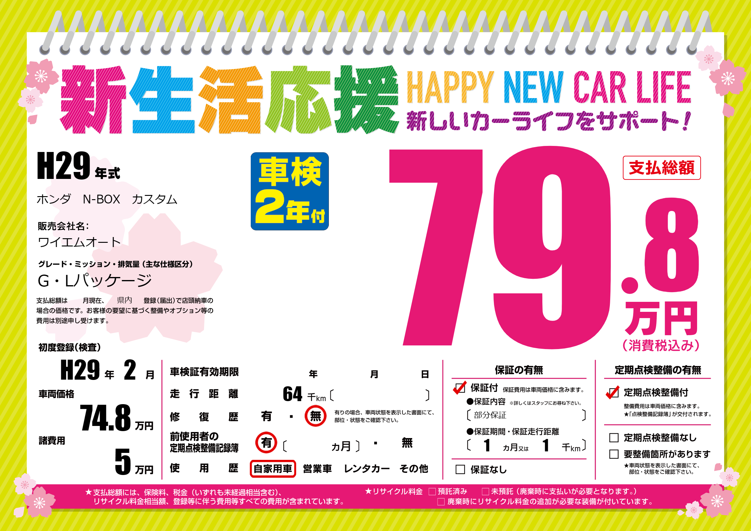 | 車名 | ホンダ N-BOX カスタム | グレード ミッション 排気量 |