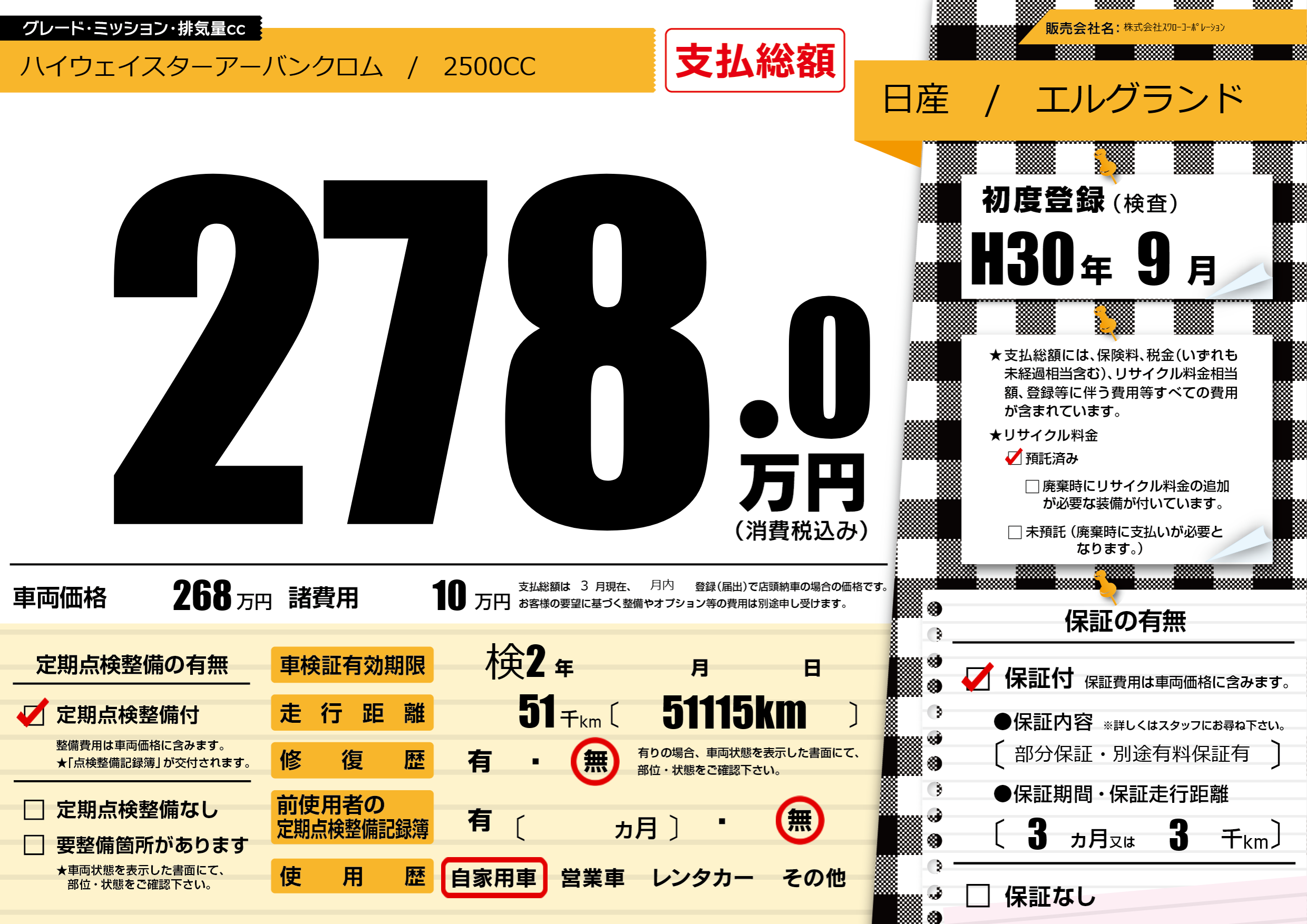 | 車名 | 日産 / エルグランド | グレード ミッション 排気量 |
